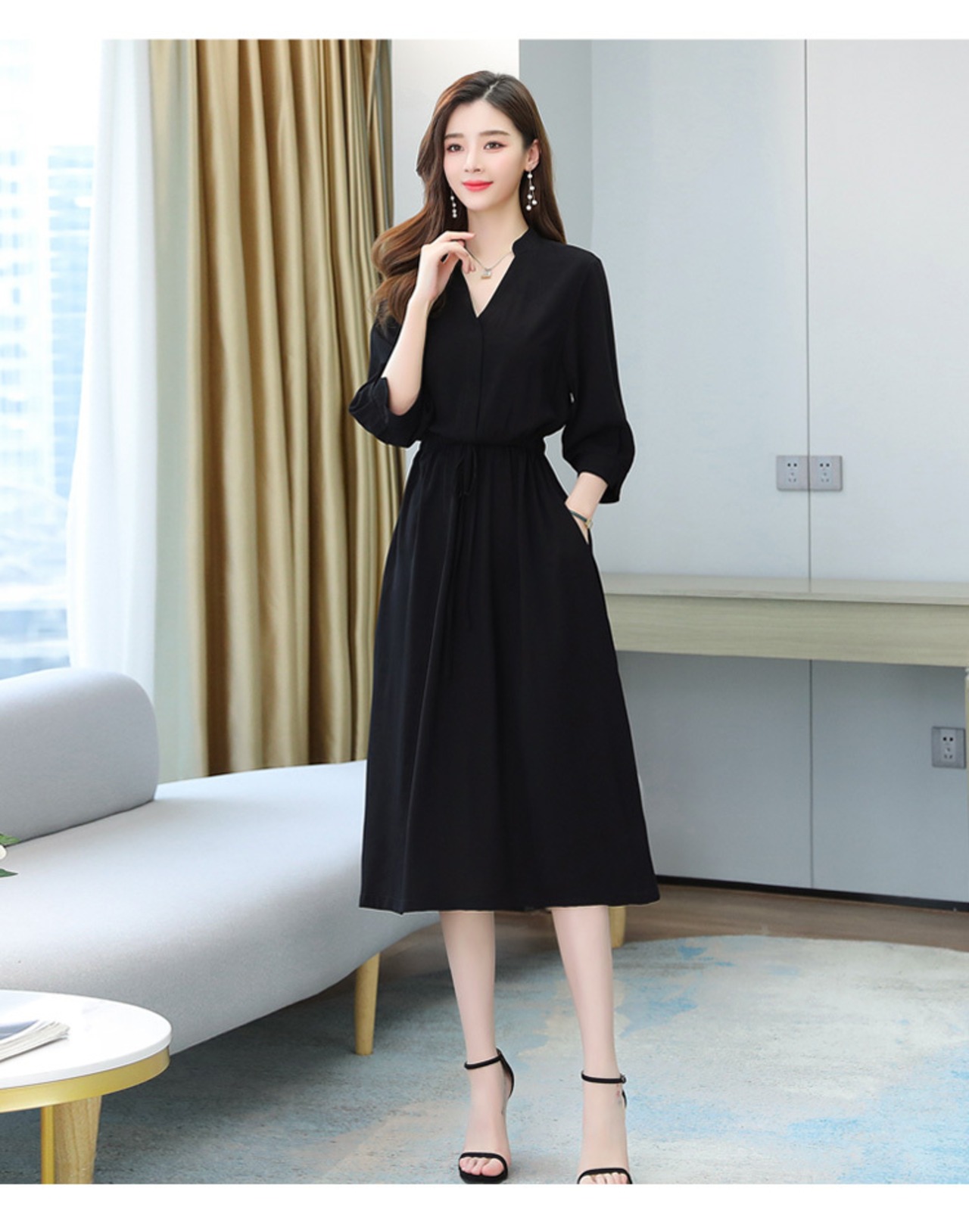 ワンピース シャツワンピース フレアワンピース 膝下 ミモレ ミモレ丈 ロング ロング丈 袖あり 7分袖 七分袖 Vネック スタンドカラー セミフレア Aライン シフォン ウエストマーク ハイウエスト かわいい 大人可愛い きれいめ シンプル カジュアル 大人 上品 おしゃれ お洒落 かっこいい エキゾチック 大人女子 こなれ感 クール エレガント モダン 抜け感 フェミニン 無地 春 夏 秋 学生 通学 デート お出かけ 着回し 普段使い モテ 体系カバー 脚長 大きいサイズ 大きめ ビッグサイズ