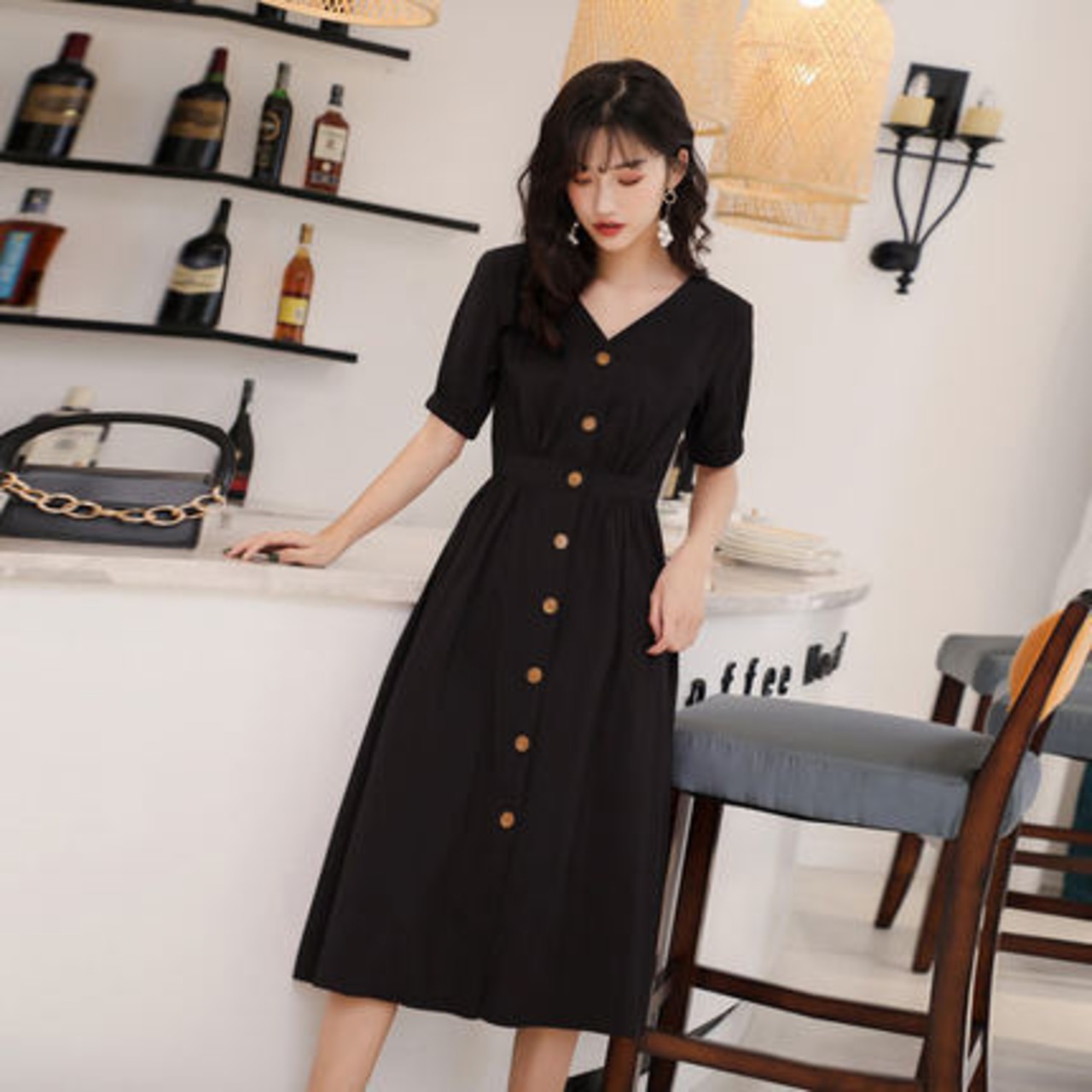 フロントについたボタンがアクセントになった、大人可愛い膝丈ワンピースです。