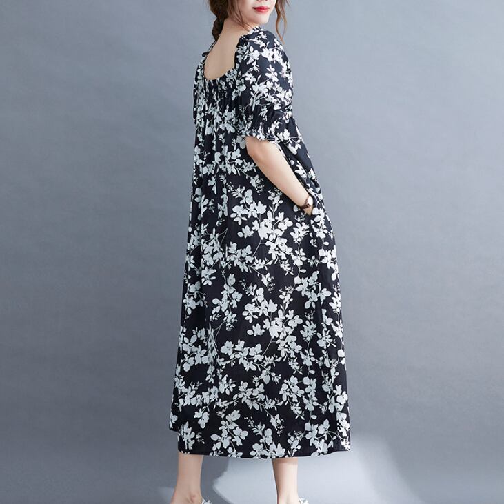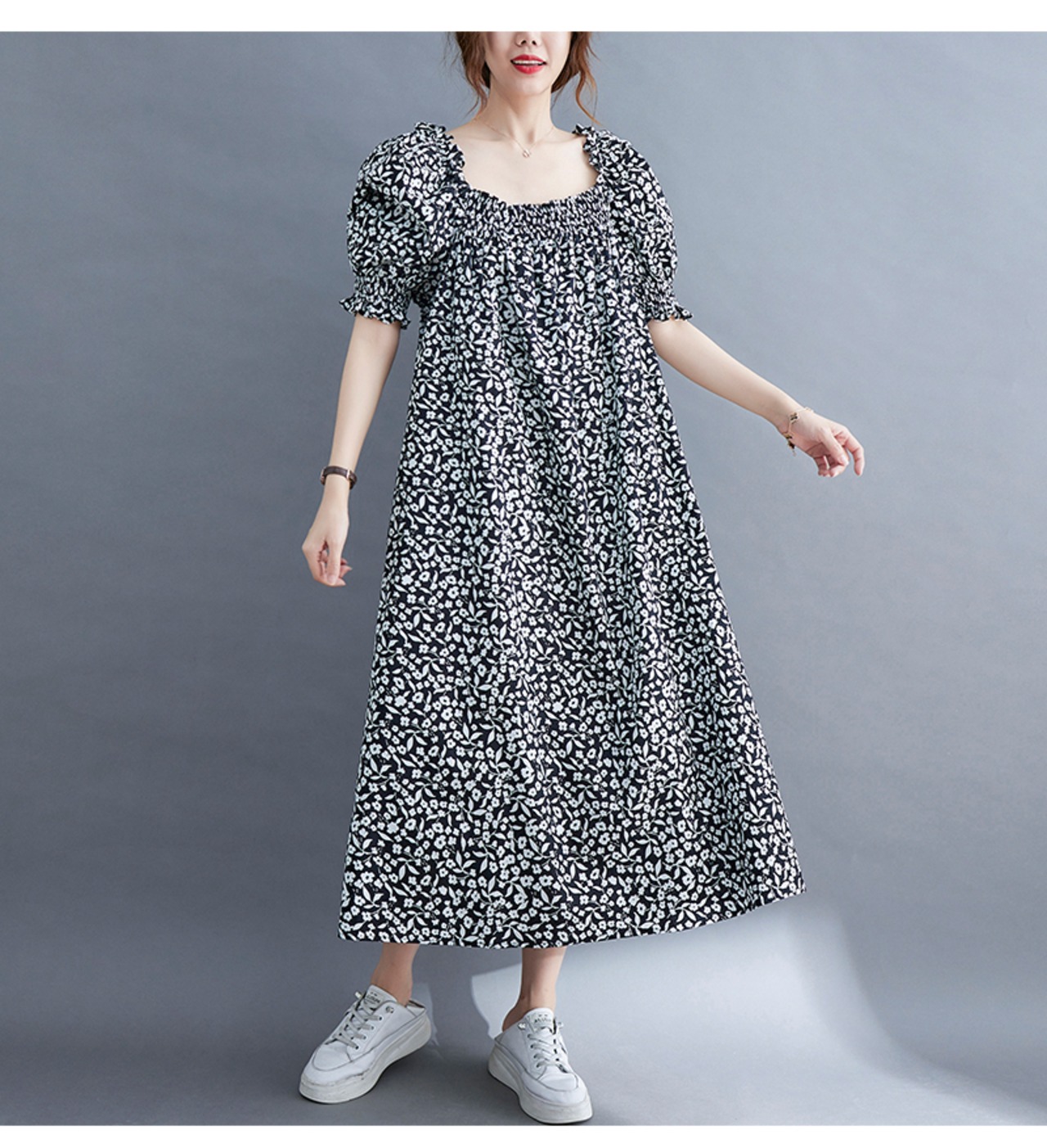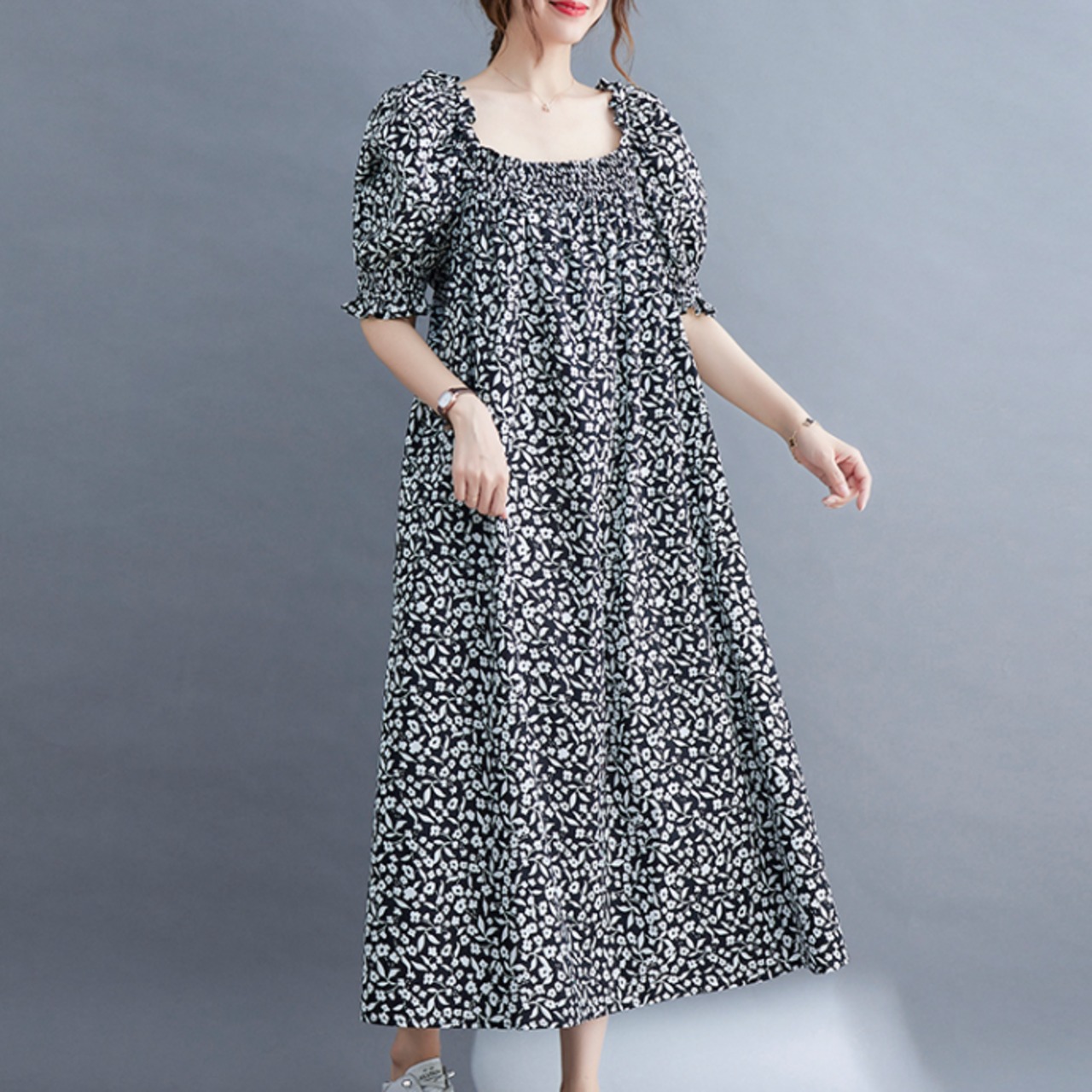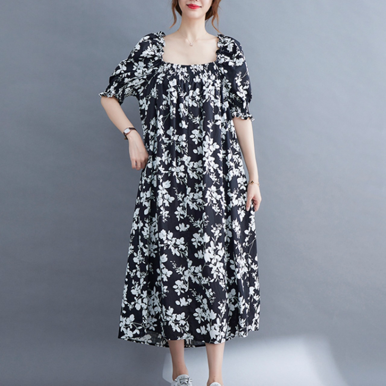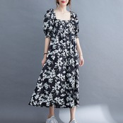 ワンピース フレアワンピース 膝下 ミモレ ミモレ丈 袖あり 半袖 スクエアネック セミフレア Aライン カジュアル 大人 おしゃれ お洒落 かっこいい エキゾチック 大人女子 こなれ感 ラフ ラブリー キュート ガーリー 個性的 主役級 存在感 柄 花柄 小花柄 フラワー 春 夏 2022 2023 10代 20代 30代 40代 50代 60代 レディース 女性用 お出かけ 休日 イベント リゾート 旅行 海 フリーサイズ 黒 ブラック 灰色 グレー オフホワイト ベージュ