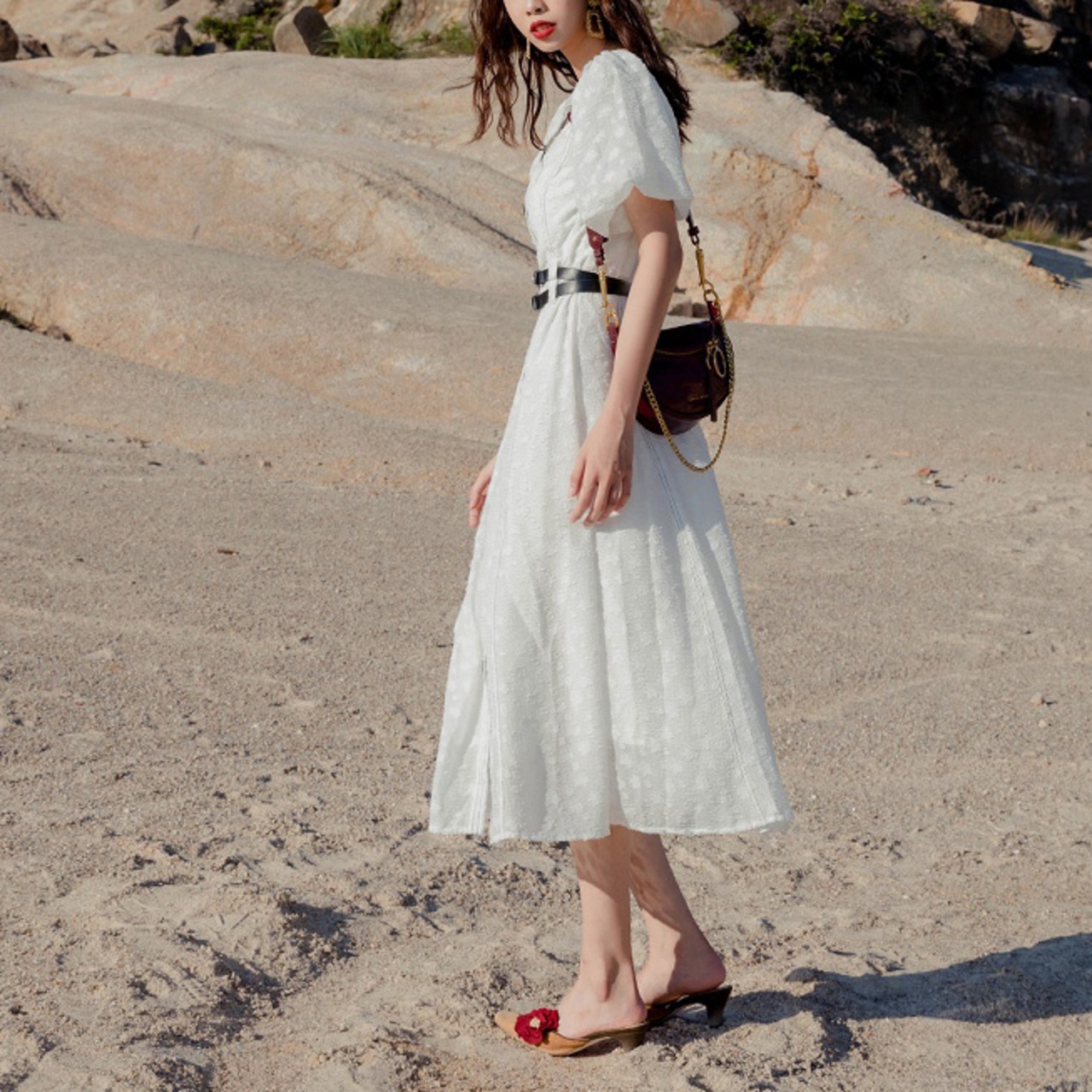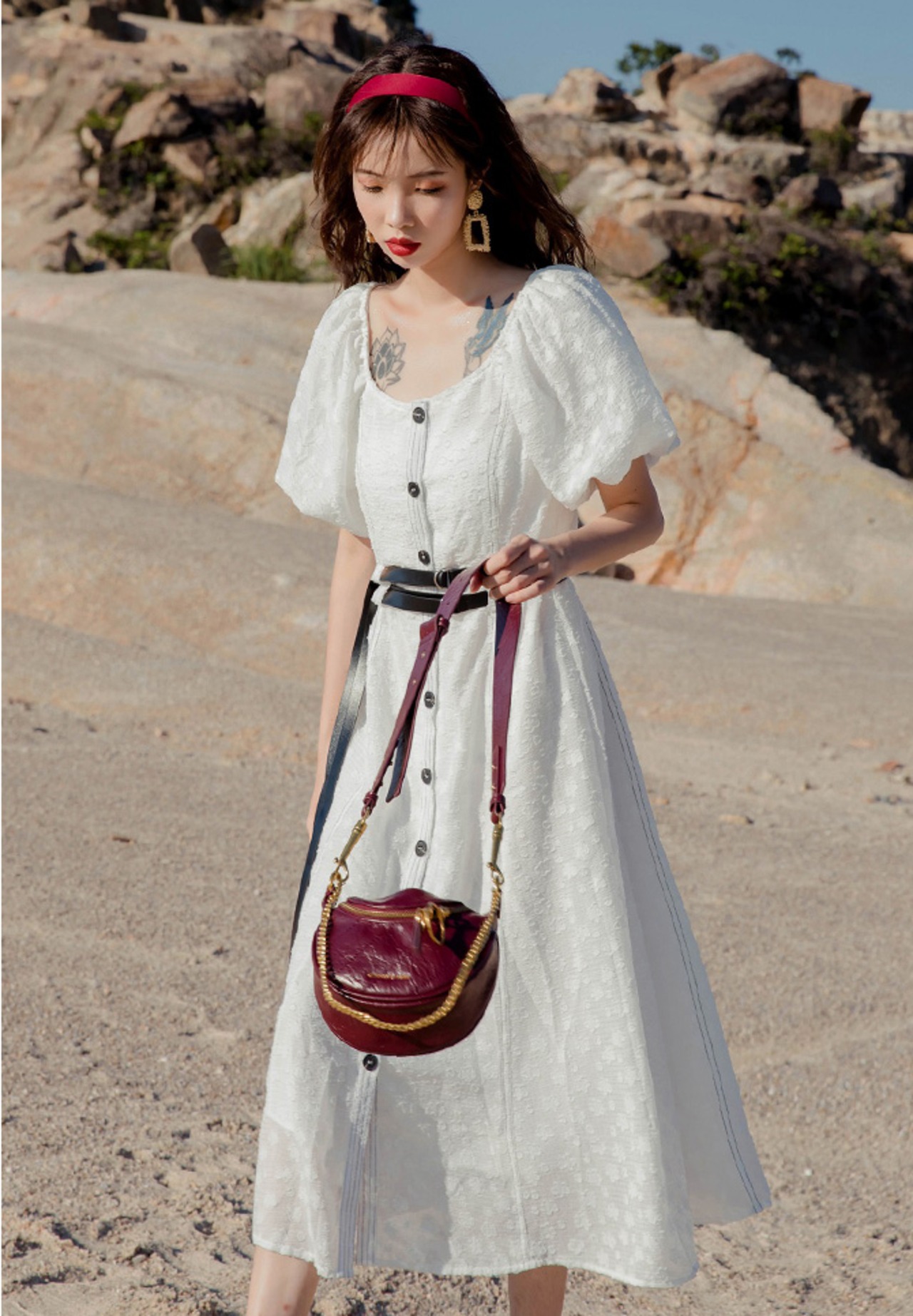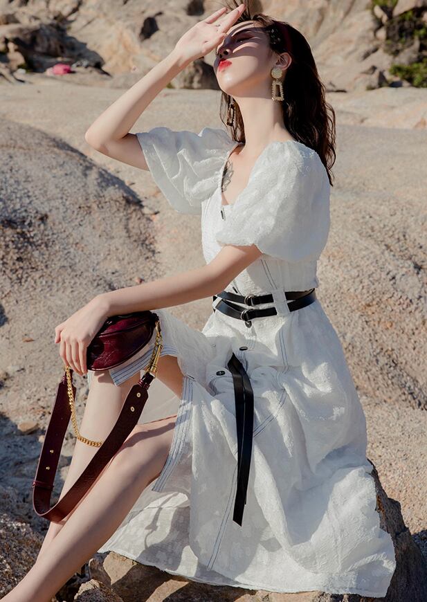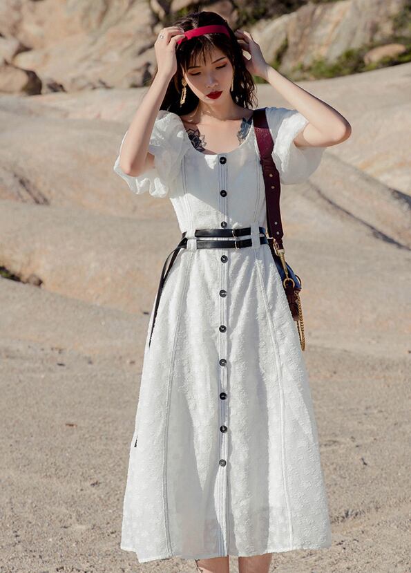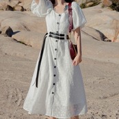 ワンピース フレアワンピース 膝下 ミモレ ミモレ丈 袖あり 半袖 ボリューム袖 Uネック フレア セミフレア ベルト ウエストマーク 前開き 大人可愛い きれいめ おしゃれ お洒落 大人女子 こなれ感 ラブリー キュート ガーリー エレガント 主役級 存在感 春 夏 2022 2023 10代 20代 30代 レディース 女性用 キッズ 女の子 デート お出かけ 休日 スタイル 楽ちん モテ 体系カバー インスタ映え S M L XL 白 ホワイト