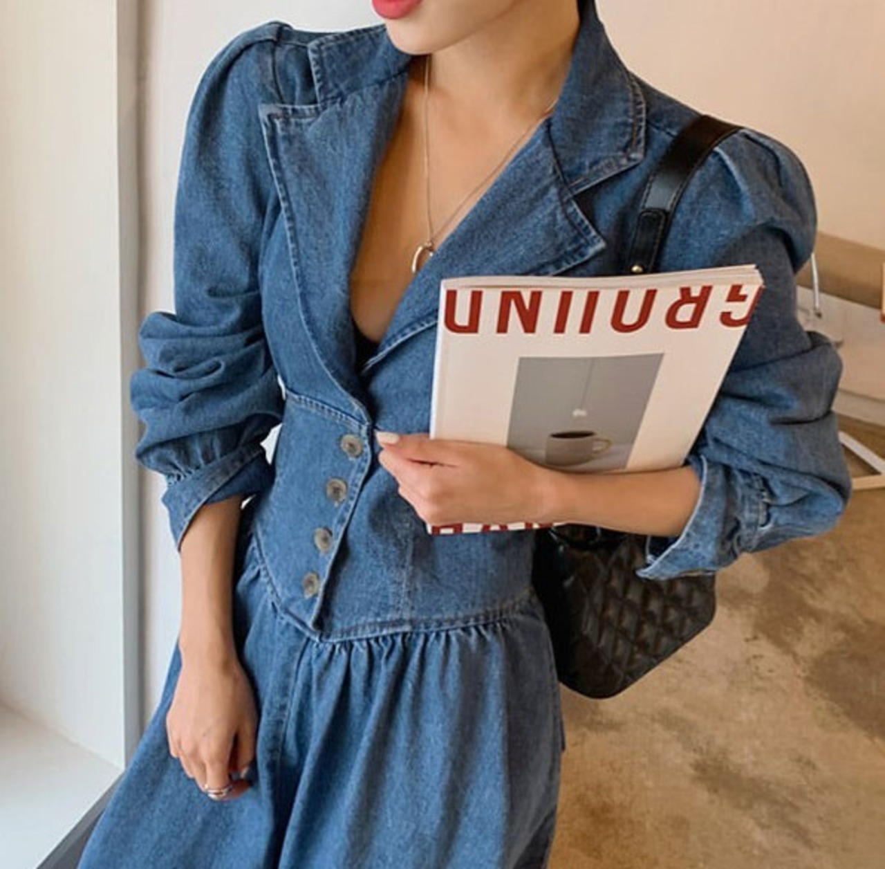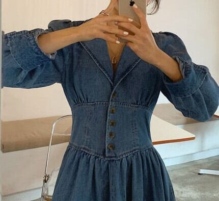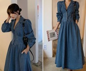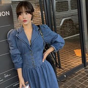 テーラードカラーにウエスト切り替えがおしゃれなデニムワンピースです。