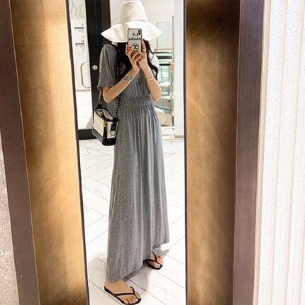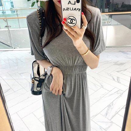 ワンピース ロング ロング丈 マキシ マキシ丈 袖あり 半袖 ラウンドネック セミフレア ワイド ウエストマーク きれいめ シンプル カジュアル 大人 おしゃれ お洒落 かっこいい 大人女子 こなれ感 ラフ メンズライク マニッシュ ボーイッシュ スポーティー とろみ感 抜け感 無地 春 夏 2022 2023 10代 20代 30代 40代 50代 60代 レディース 女性用 ママ マタニティ お出かけ 休日 リゾート 旅行 スタイル 楽ちん 体系カバー S M L XL 黒 ブラック 灰色 グレー