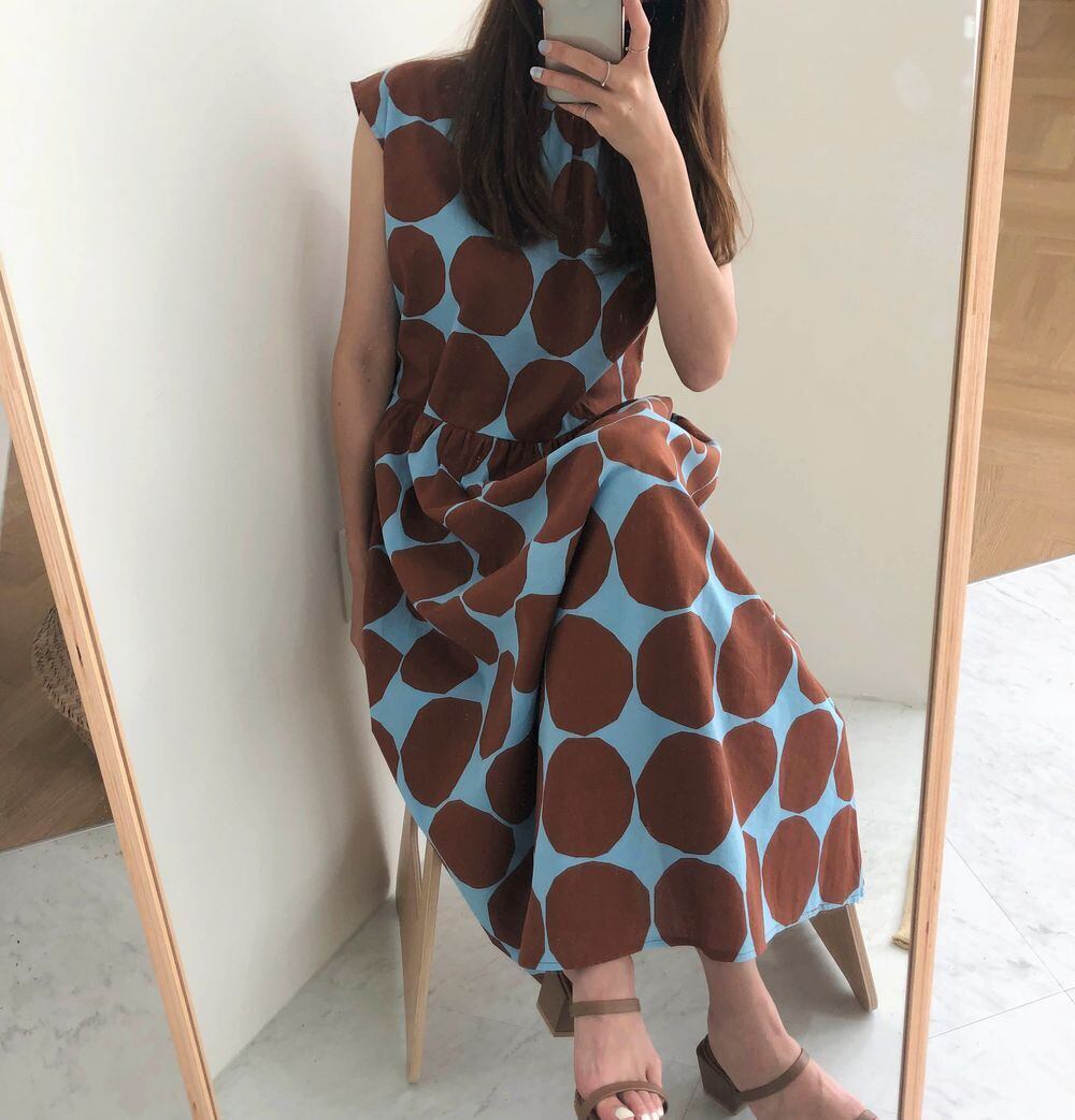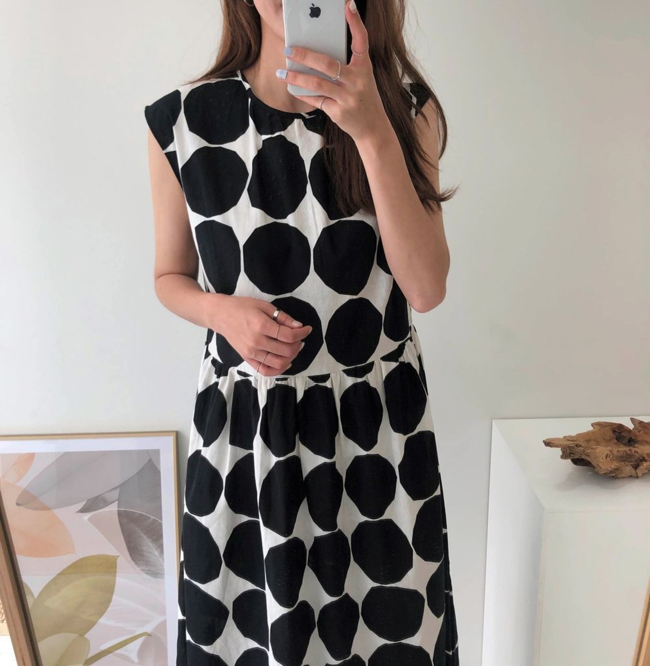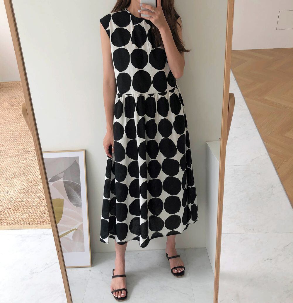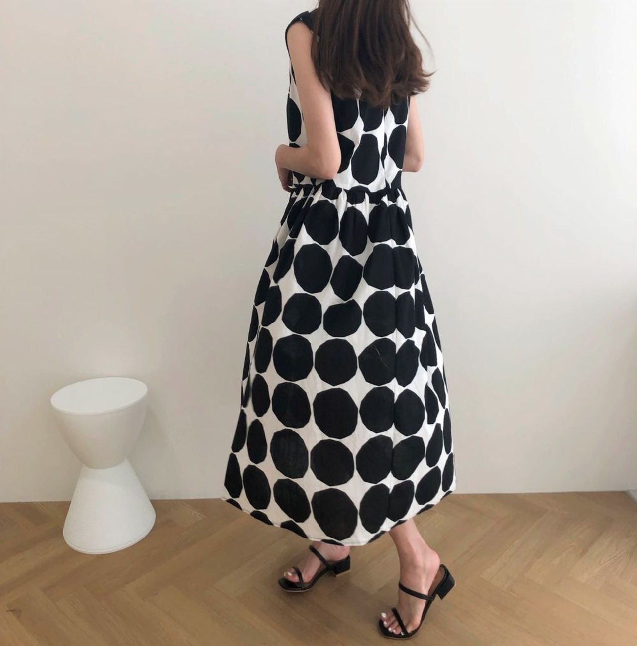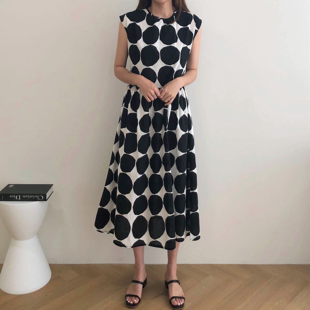ワンピース フレアワンピース ロング ロング丈 ノースリーブ ラウンドネック フレア セミフレア カジュアル おしゃれ お洒落 キュート 個性的 主役級 存在感 柄 ドット柄 水玉 春 夏 秋 2022 2023 10代 20代 30代 40代 50代 60代 レディース 女性用 お出かけ 休日 リゾート 旅行 ファッション コーデ スタイル 楽ちん フリーサイズ 白 ホワイト 黒 ブラック 茶色 ブラウン 水色