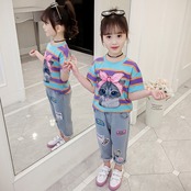 【子ども】猫柄ストライプTシャツとカジュアルジーンズ 2点セット 水色×ピンク キッズ カジュアル 110 120 130 140 150cm