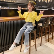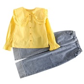 【子ども】女の子 かわいい 大きな襟シャツとジーンズ 2点セット 黄色 白 長袖 ブラウス 110 120 130 140 150cm