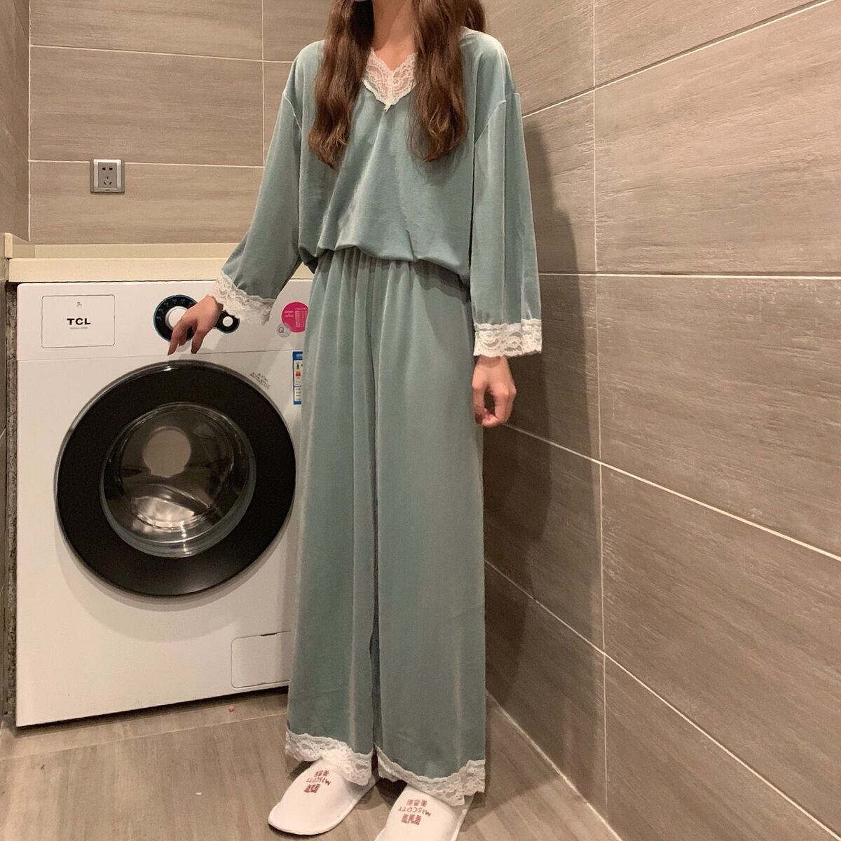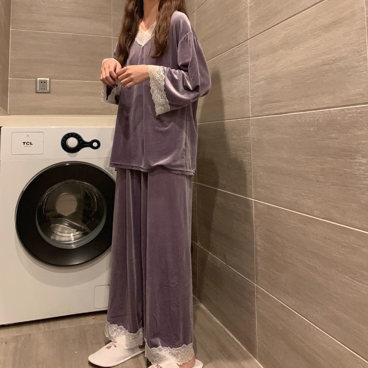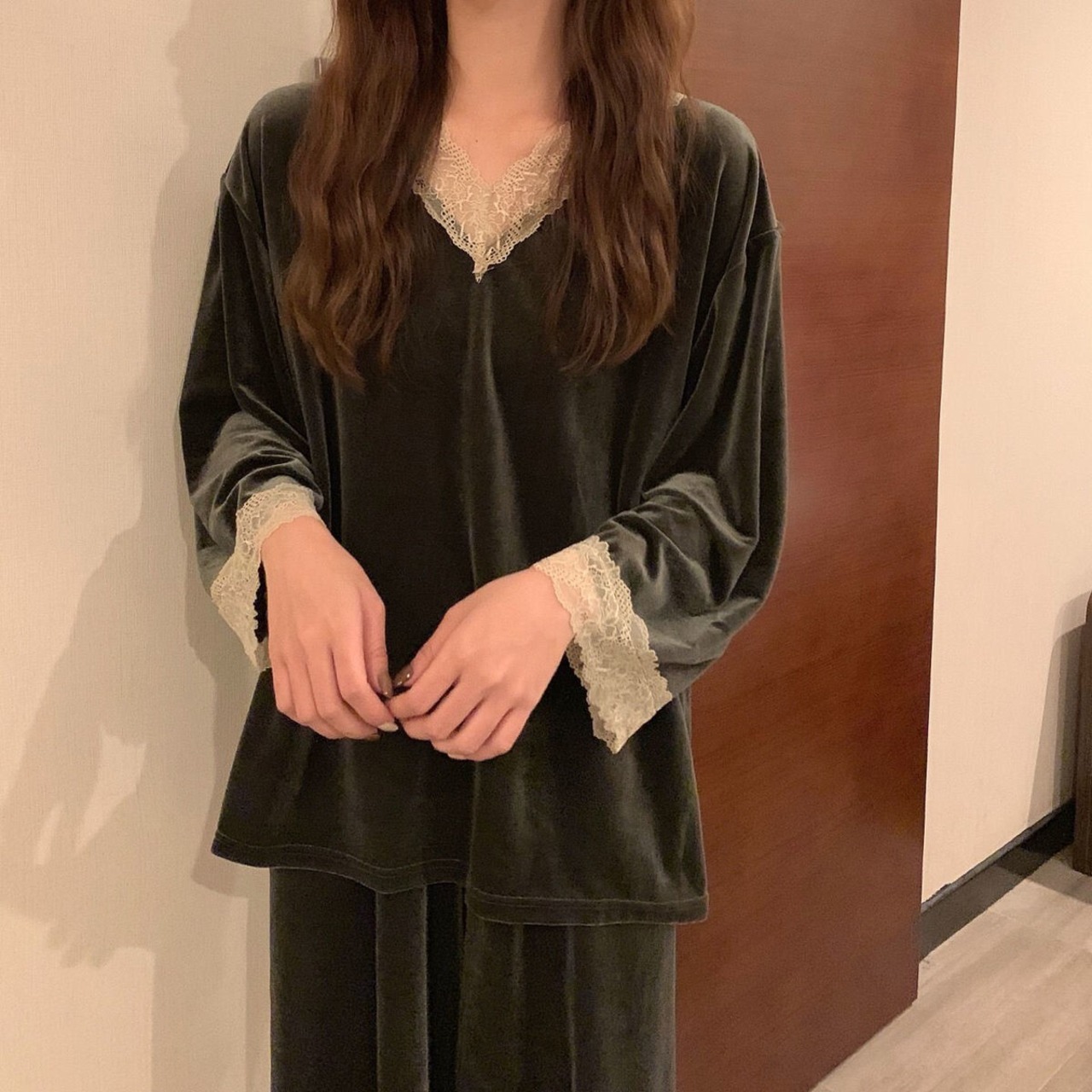 トップス ボトムス パンツ ルームウェア パジャマ プルオーバー ワイドパンツ 袖あり 長袖 ボリューム袖 Vネック ワイド レース ウエストゴム 上下セット 2点セット ツーピース かわいい 大人可愛い きれいめ シンプル 大人 上品 おしゃれ お洒落 レトロ 大人女子 こなれ感 ラフ キュート ガーリー ルーズ エレガント とろみ感 抜け感 フェミニン クラシカル ロマンチック 無地 春 秋 レディース 女性用 デート 女子会 お泊まり 休日 普段使い お揃い 楽ちん モテ プレゼント ギフト