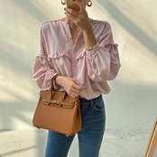 胸元のフリルとボリューム袖がかわいいトップスです。