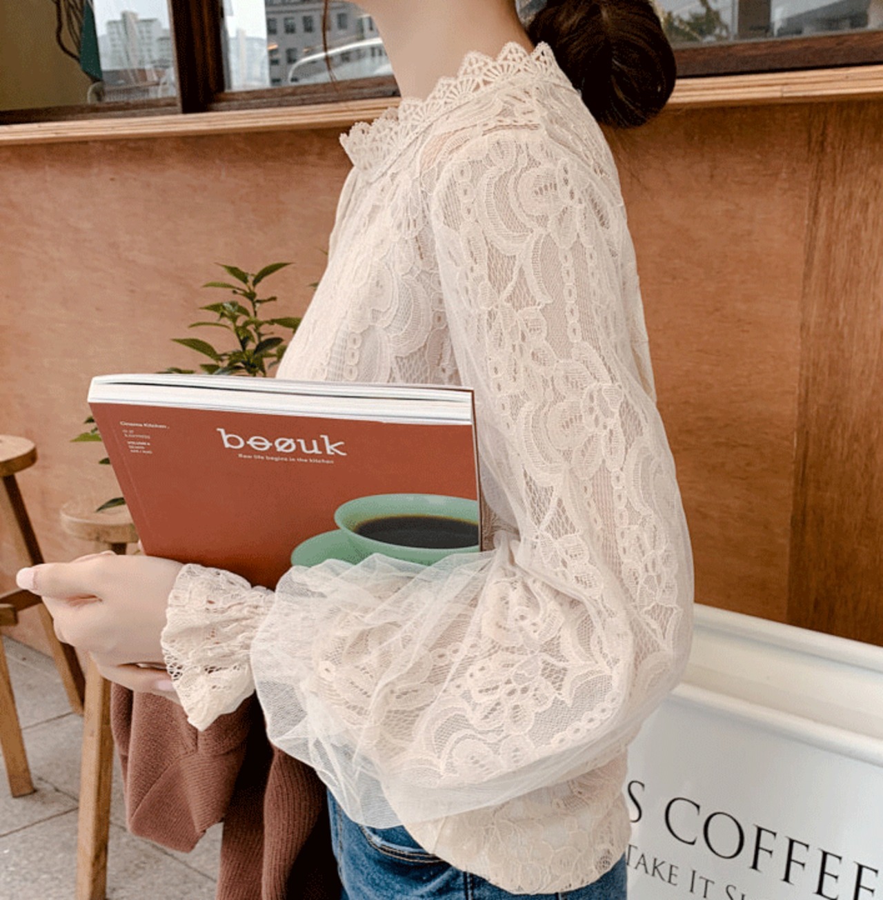 レースの透け感とランタンスリーブがかわいいトップスです。