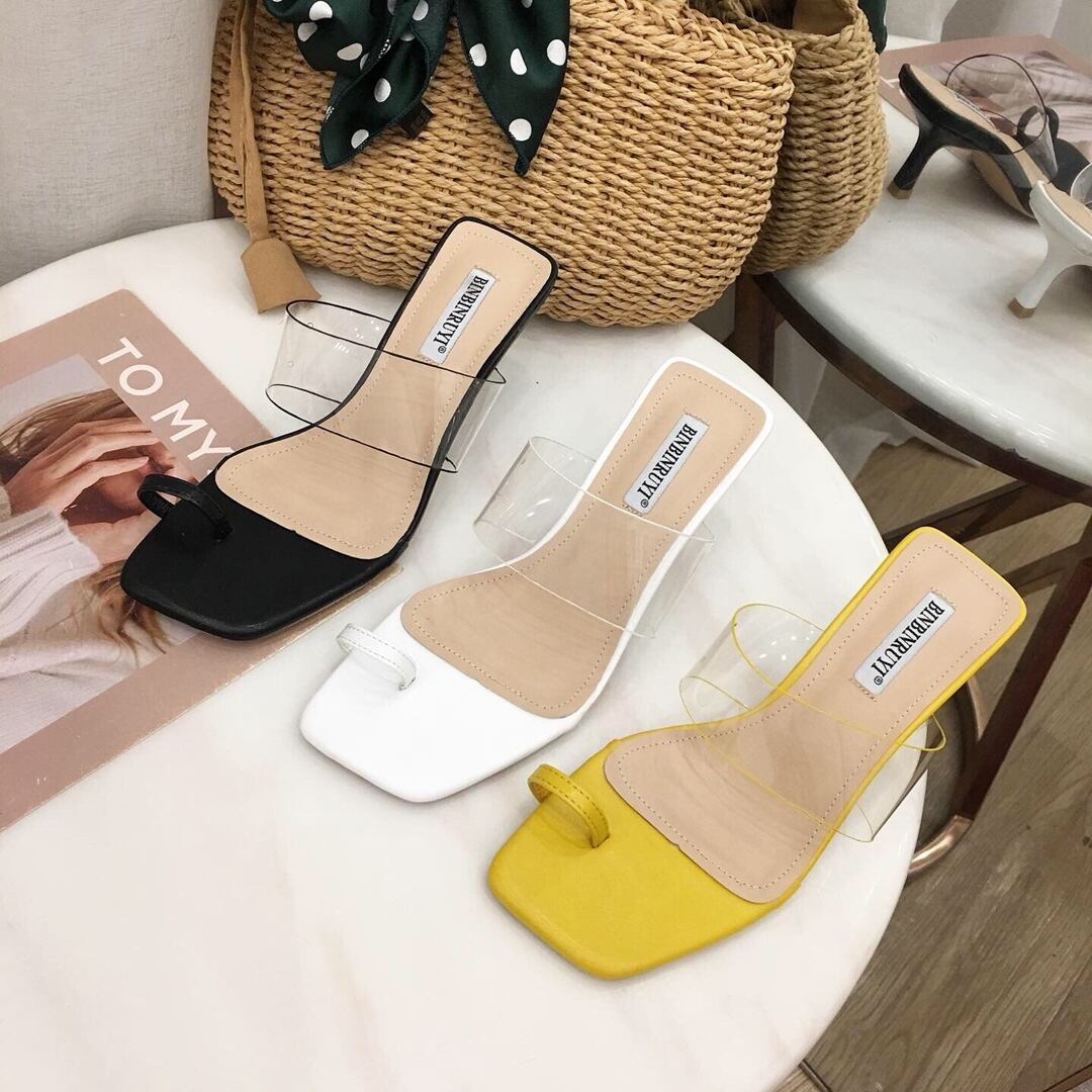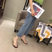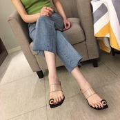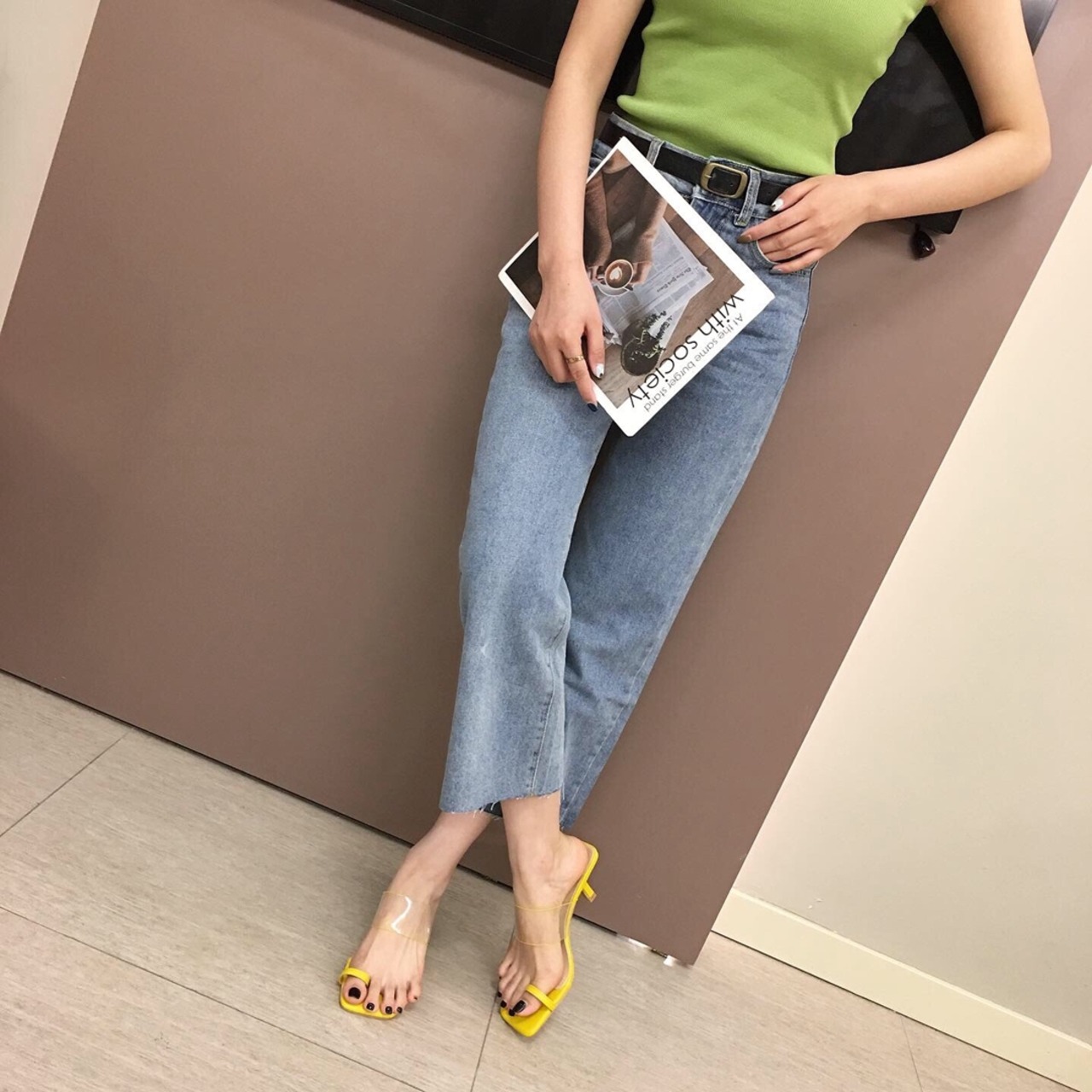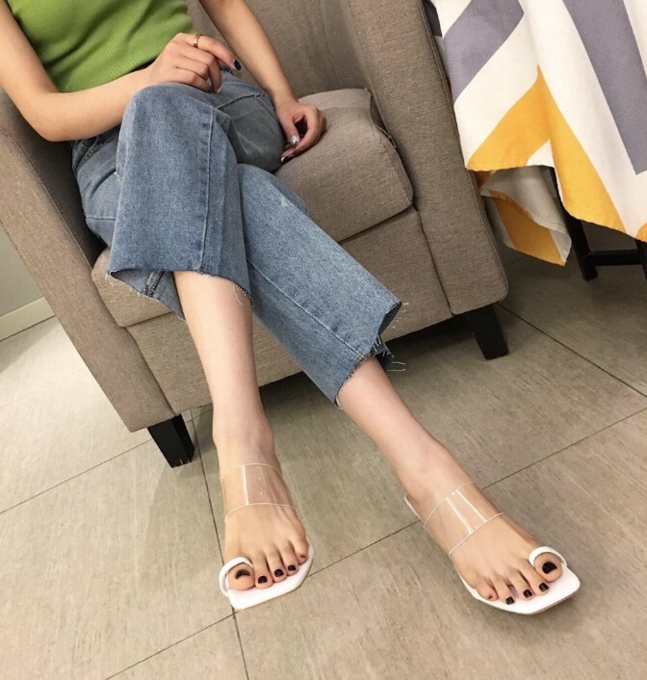 クリア素材のベルトが涼しげなミドルヒールサンダルです。