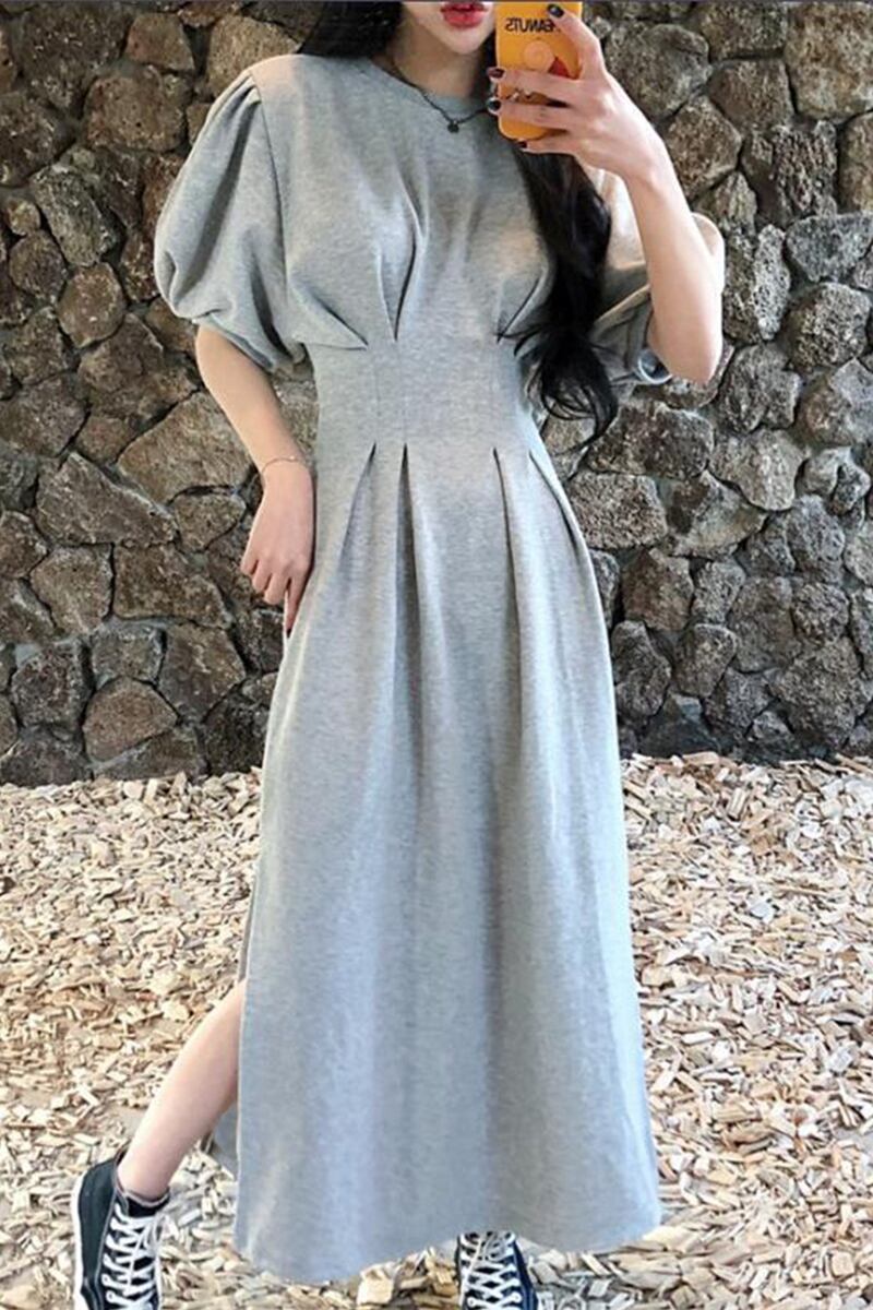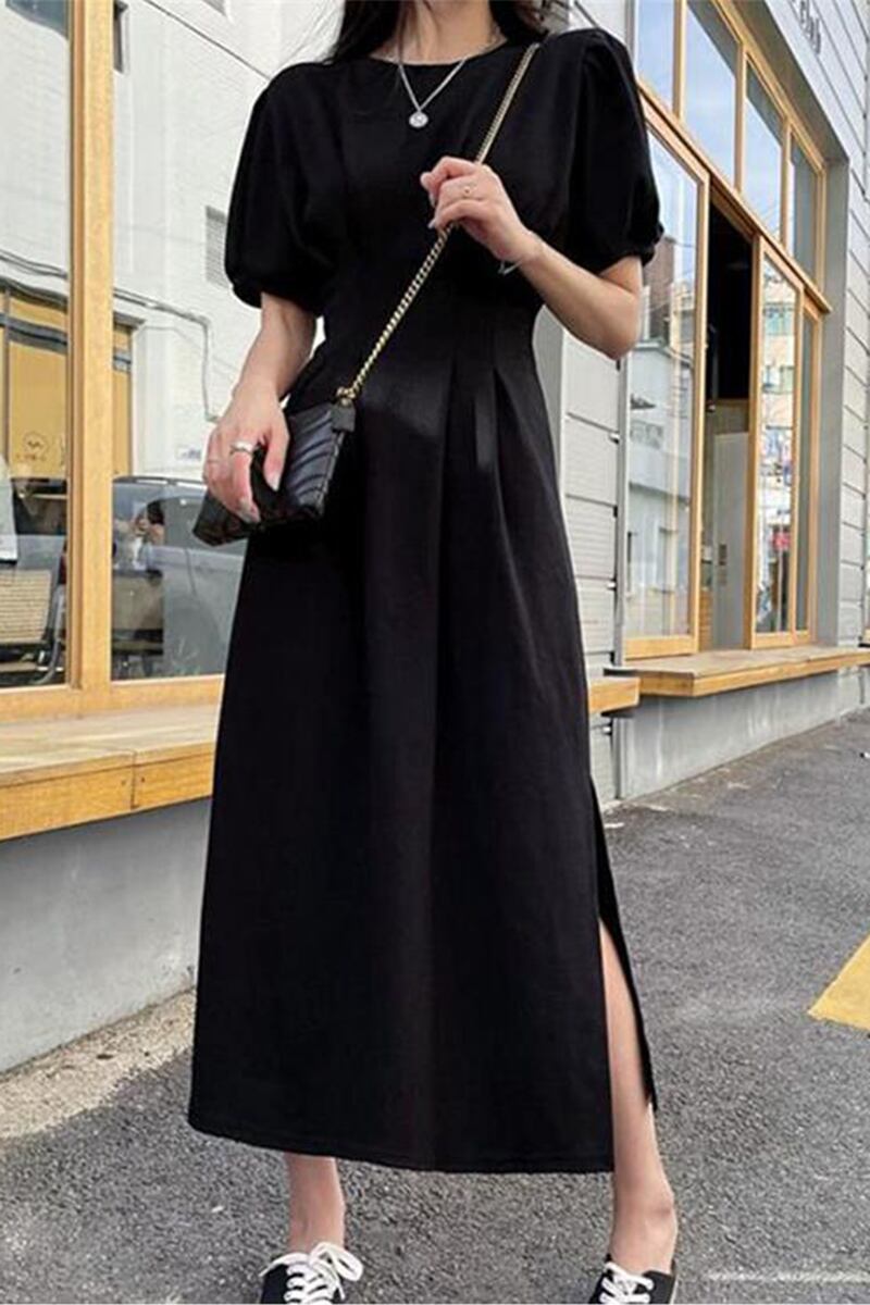ワンピース フレアワンピース ロング ロング丈 9分丈 アンクル丈 袖あり 半袖 ボリューム袖 ラウンドネック フレア セミフレア ワイド Aライン スリット サイドスリット きれいめ シンプル カジュアル 大人 おしゃれ お洒落 かっこいい 大人女子 こなれ感 ラフ メンズライク セクシー 無地 春 夏 2022 2023 10代 20代 30代 40代 50代 レディース 女性用 キッズ 女の子 お出かけ 休日 S M L XL 黒 ブラック 灰色 グレー
