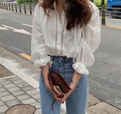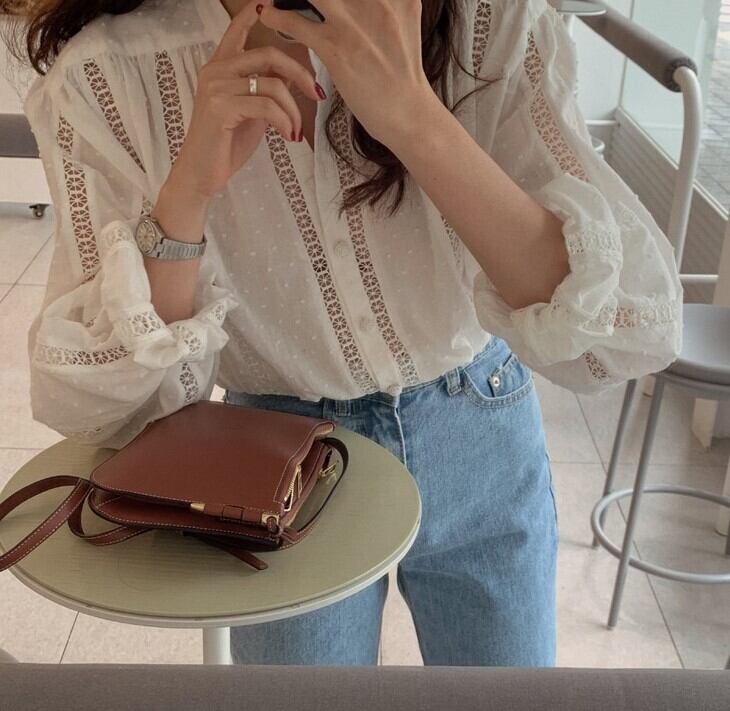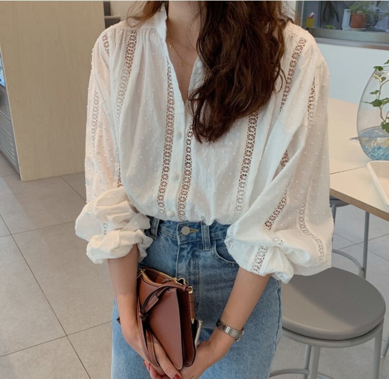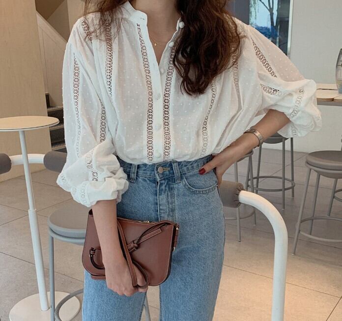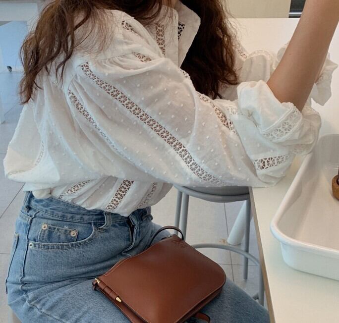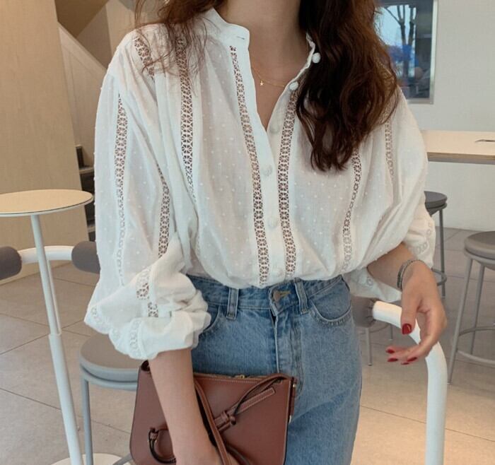 トップス ブラウス カットソー 白シャツ 白トップス 袖あり 長袖 ボリューム袖 ラウンドネック ハイネック スタンドカラー レース ウエストゴム かわいい 大人可愛い きれいめ 大人 おしゃれ お洒落 かっこいい 大人可愛い 大人女子 こなれ感 ラブリー ガーリー 抜け感 ドット柄 春 夏 秋 10代 20代 レディース 女性用 OL 通勤 学生 通学 デート お出かけ 女子会 お泊まり 休日 パーティー イベント リゾート 旅行 高原 ホテル ガーデン レストラン 着回し フリーサイズ 白 ホワイト