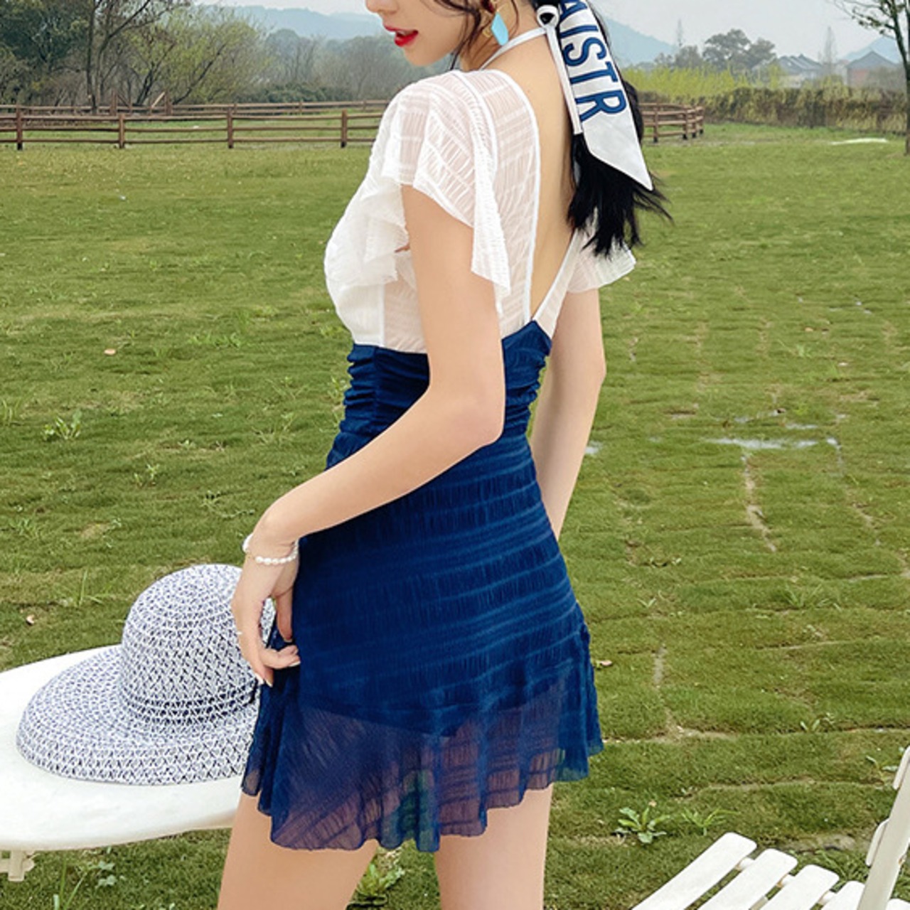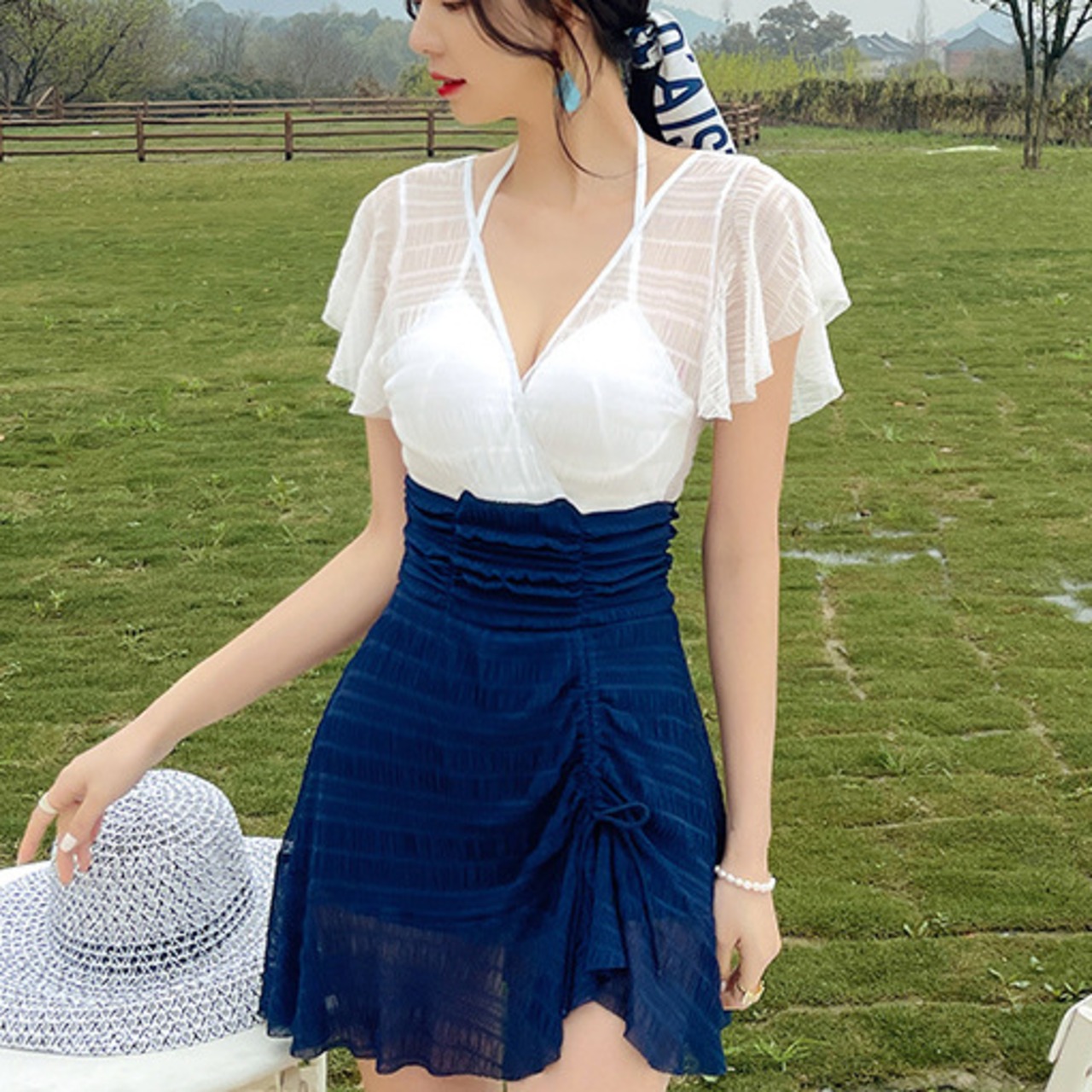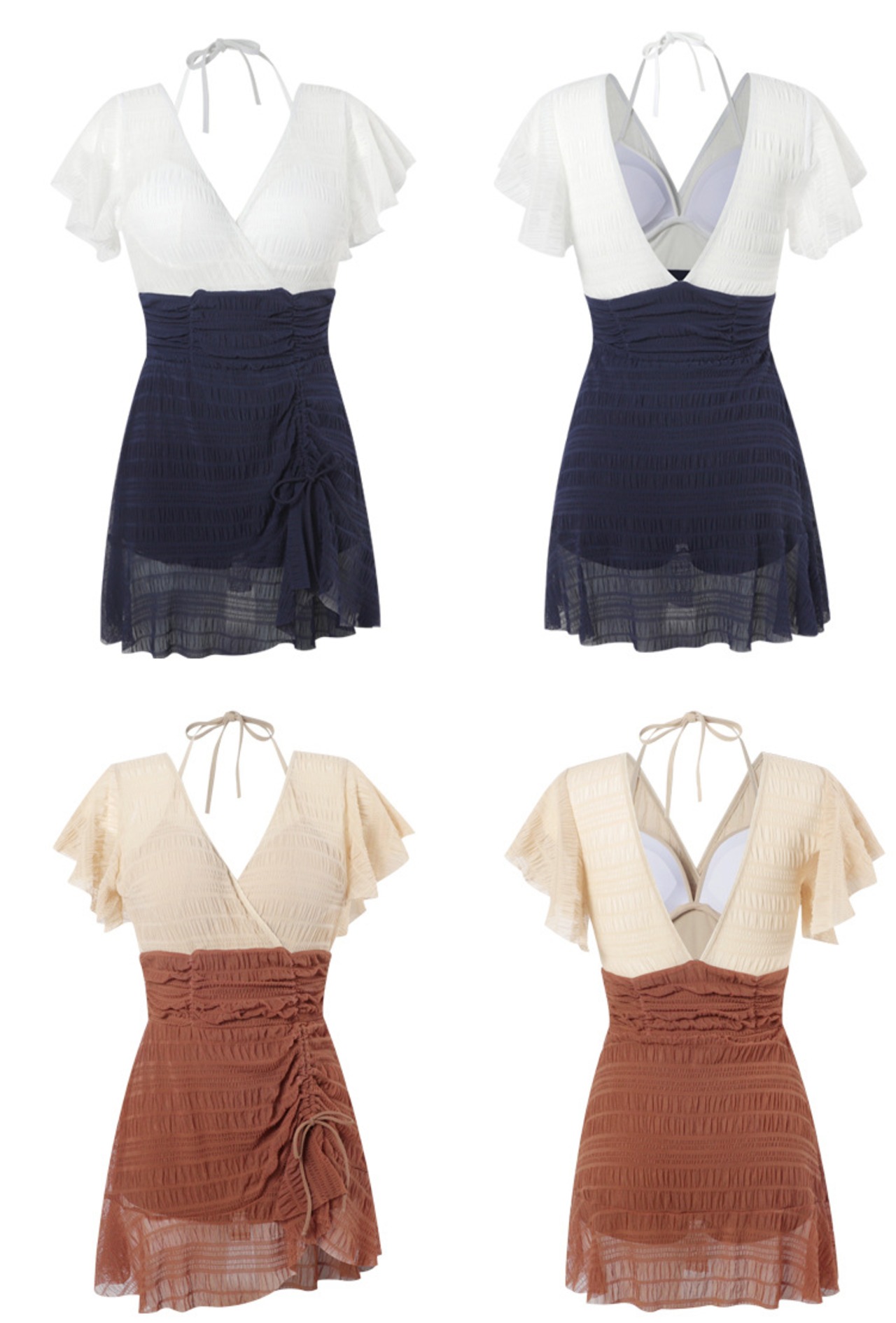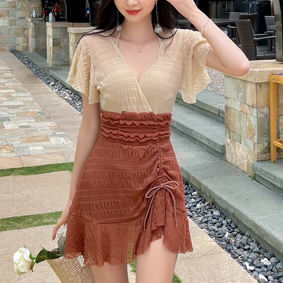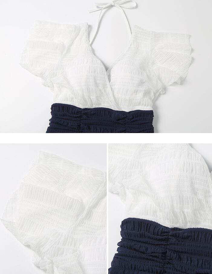 水着 体型カバー ワンピース ホルターネック ワイヤー パッド付き ウエストカバー 二の腕カバー 小胸 切り替えデザイン 伸縮性 胸元 谷間 谷間魅せ 盛れる 美ヒップ 美尻 美バスト 美胸 ギャザー フレアスリーブ かわいい 大人可愛い きれいめ シンプル カジュアル ナチュラル 大人 大人っぽい おしゃれ 主役級 存在感 女っぽ キュート ガーリー 無地 バイカラー レディース 女性用 ママ 夏 海 ビーチ プール リゾート 旅行 美脚 脚長 着痩せ スタイルアップ 美スタイル
