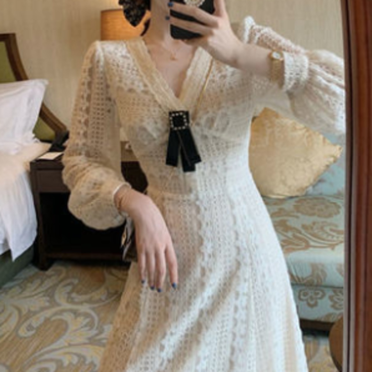 レトロ感がロマンティックなレースのミモレ丈ワンピースです。