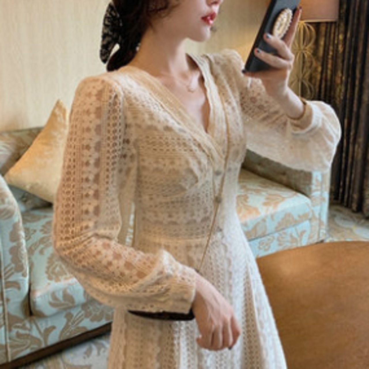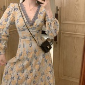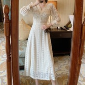 ワンピース フレアワンピース Aライン 膝下 ミモレ 長袖 Vネック フレア レース ハイウエスト 大人可愛い きれいめ 大人 上品 おしゃれ フェミニン レトロ ラブリー キュート ガーリー 個性的 エレガント ラグジュアリー 主役級 存在感 クラシカル 華やか ロマンティック 春 秋 レディース OL 学生 デート お出かけ 女子会 お泊まり 休日 旅行 ホテル レストラン 着回し 普段使い 華奢見え 美デコルテ スタイルアップ コーデ モテ 体系カバー 美脚 脚長 くすみカラー