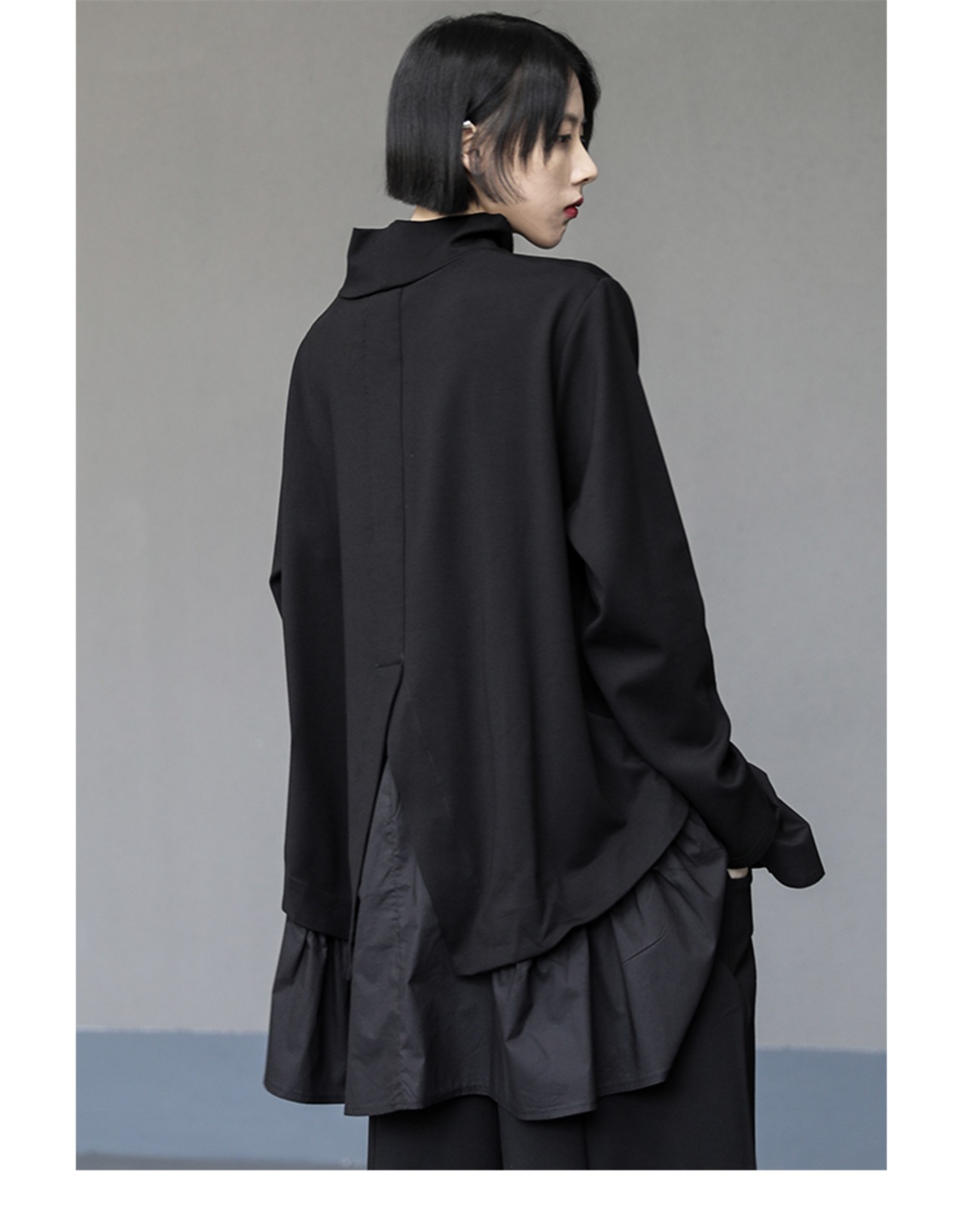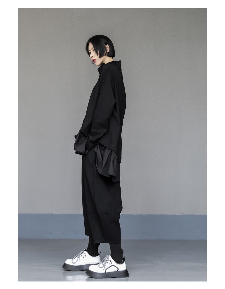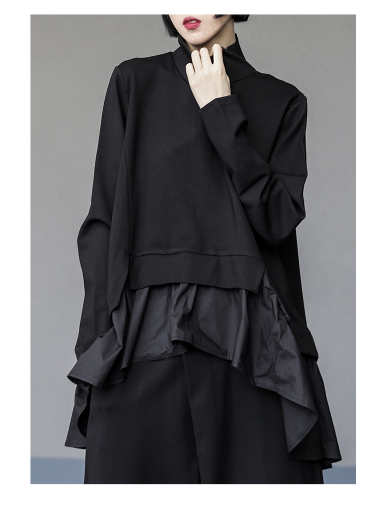 光沢感のあるブラウスと、タートルネックのロングTシャツを、ドッキングしたトップスです。