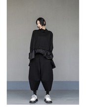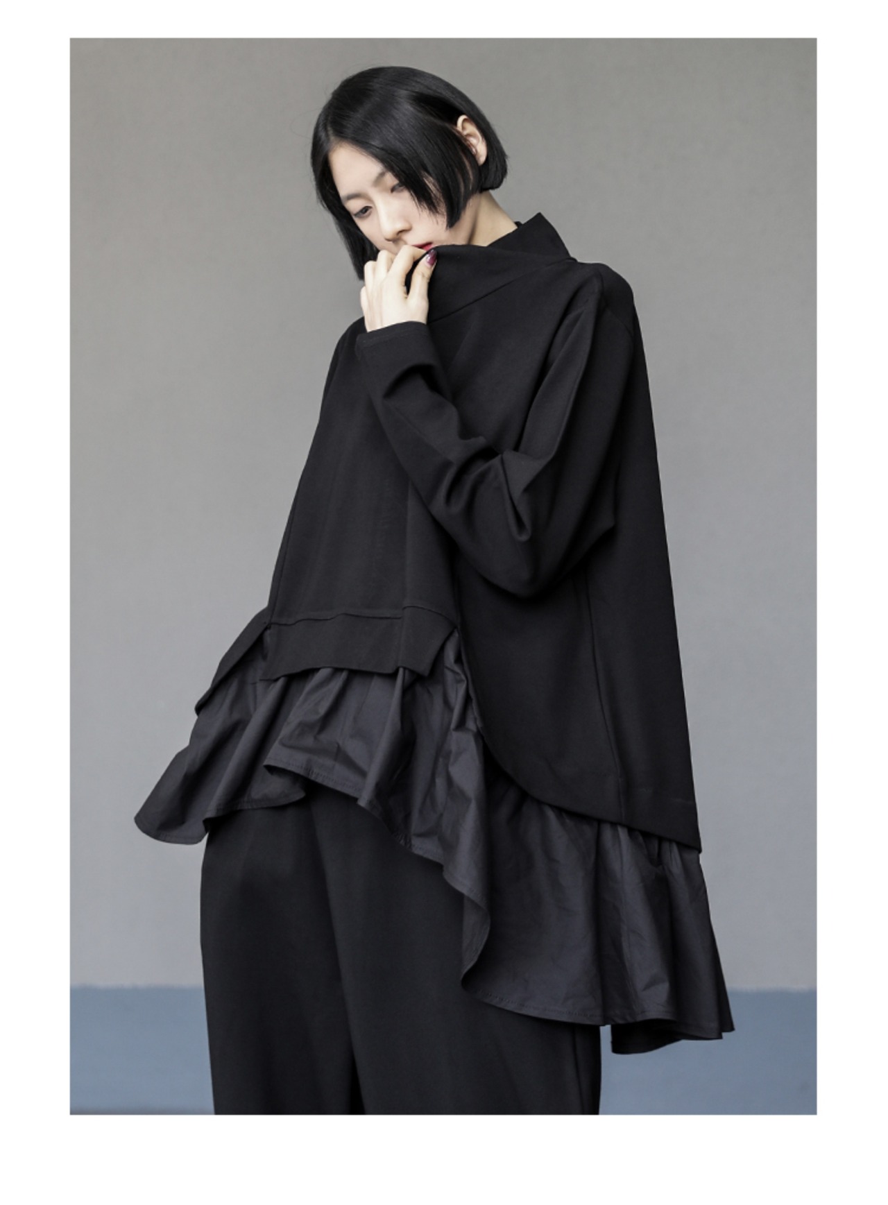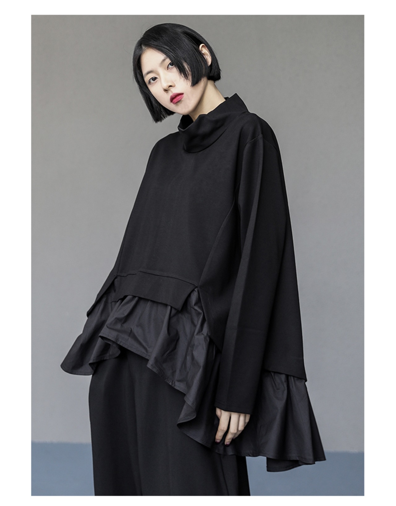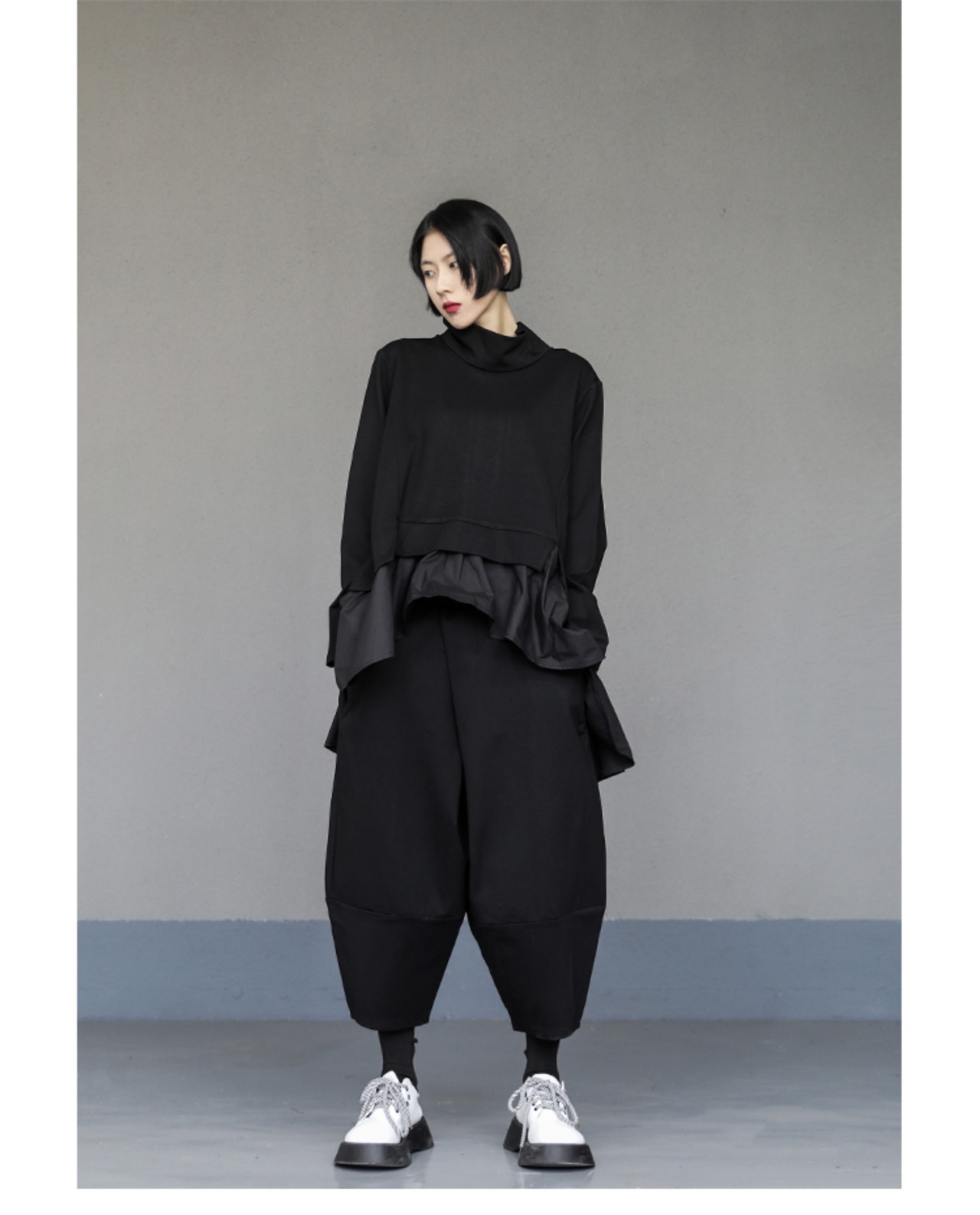光沢感のあるブラウスと、タートルネックのロングTシャツを、ドッキングしたトップスです。