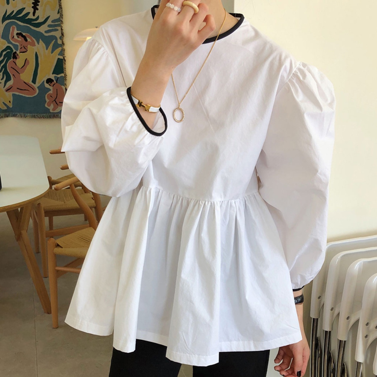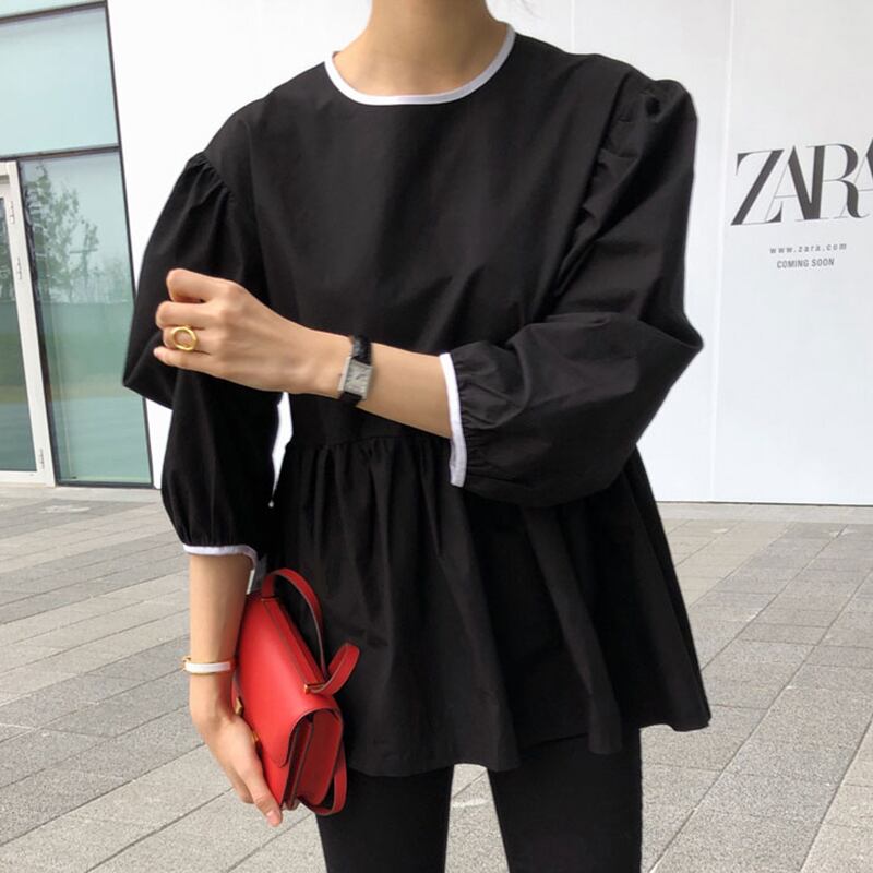 トップス ブラウス 袖あり 長袖 ボリューム袖 ラウンドネック フレア ペプラム リボン バックシャン 大人可愛い きれいめ シンプル カジュアル 大人 上品 おしゃれ お洒落 大人女子 こなれ感 ラブリー キュート ガーリー 無地 春 夏 秋 冬 オールシーズン シーズンレス 2022 2023 10代 20代 30代 40代 50代 60代 レディース 女性用 デート お出かけ 公園デビュー 休日 ファッション コーデ スタイル 楽ちん モテ フリーサイズ 白 ホワイト 黒 ブラック