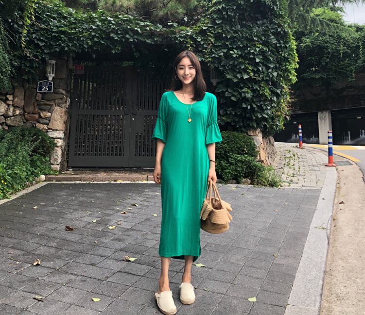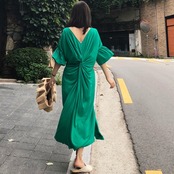 ワンピース ロング ロング丈 マキシ マキシ丈 袖あり 半袖 7分袖 七分袖 ボリューム袖 ラウンドネック ストレート Iライン バックシャン バックコンシャス きれいめ シンプル 大人 上品 おしゃれ お洒落 かっこいい 大人女子 こなれ感 ラフ セクシー エレガント 主役級 存在感 とろみ感 無地 春 夏 2022 2023 10代 20代 30代 40代 50代 60代 レディース 女性用 休日 パーティー イベント リゾート 旅行 S M L XL 黒 ブラック 緑 グリーン