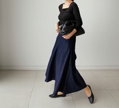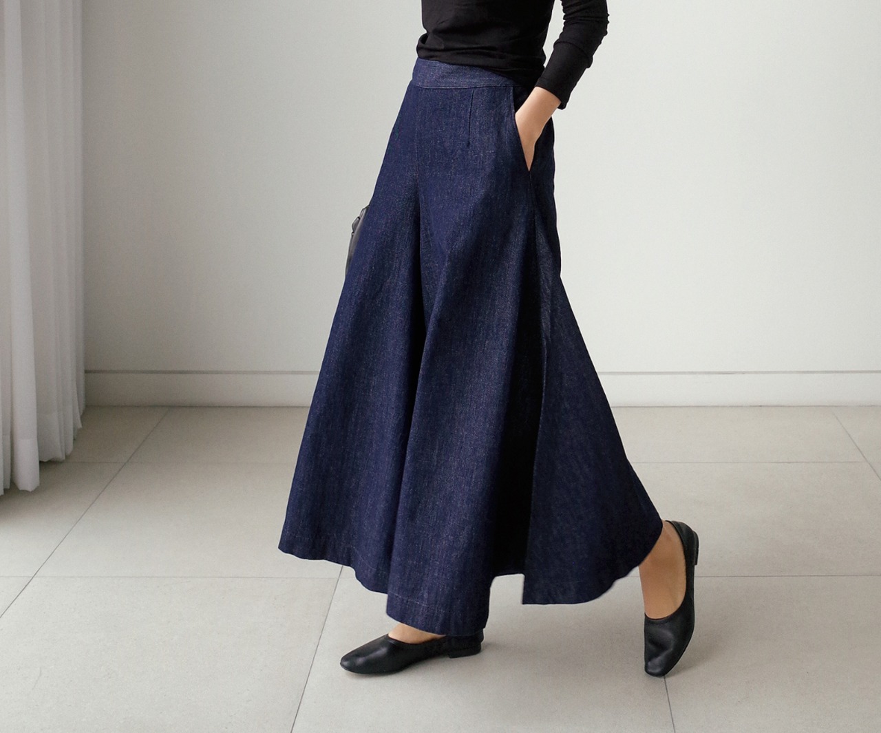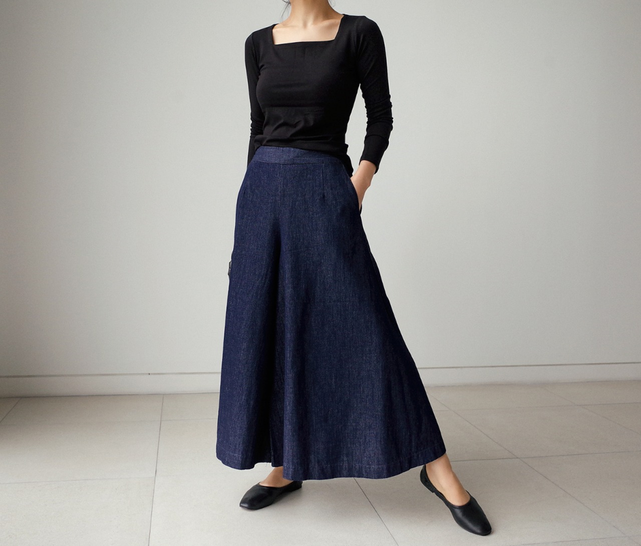 フレアスカートのようなAラインシルエットが特徴的なガウチョパンツです。