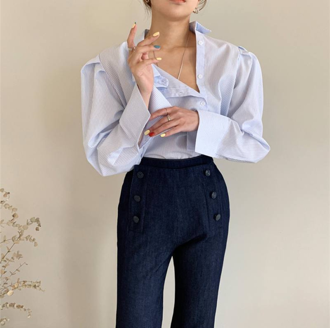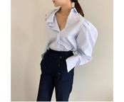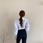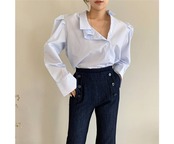 パワーショルダーとアシンメトリーデザインが個性的でかわいい、ブラウスです。