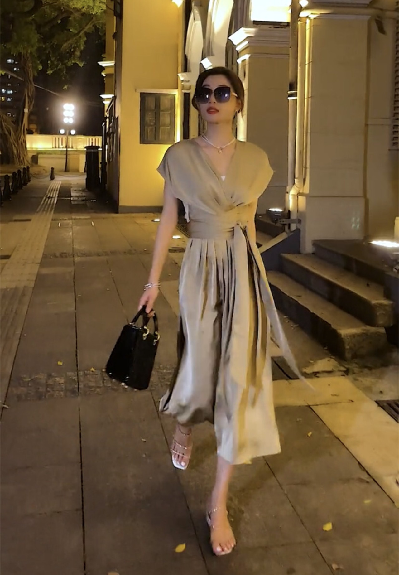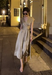 カシュクールやフレンチスリーブが女性的で、抜け感のある魅力的な一着です。