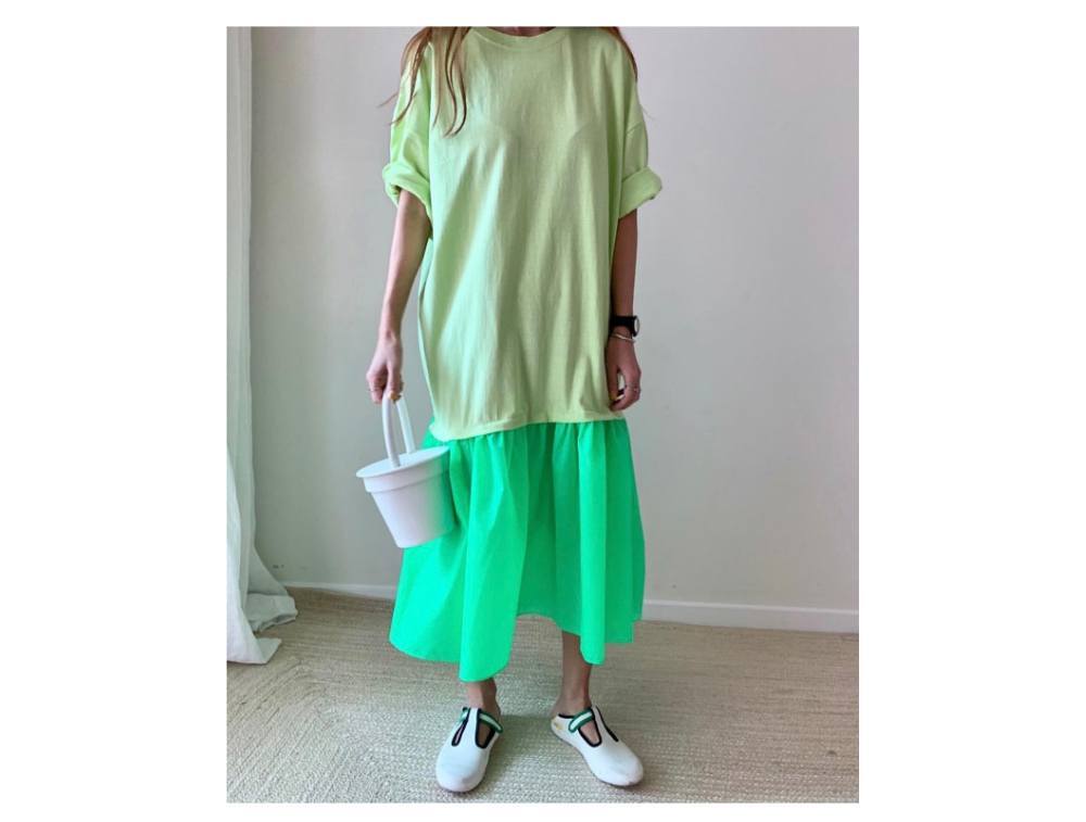 シンプルなデザインでありながら、鮮やかなカラーが目を引くTシャツワンピースです。