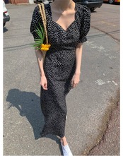 スイートハートネックやパフスリーブがロマンチックなフレアワンピースです。