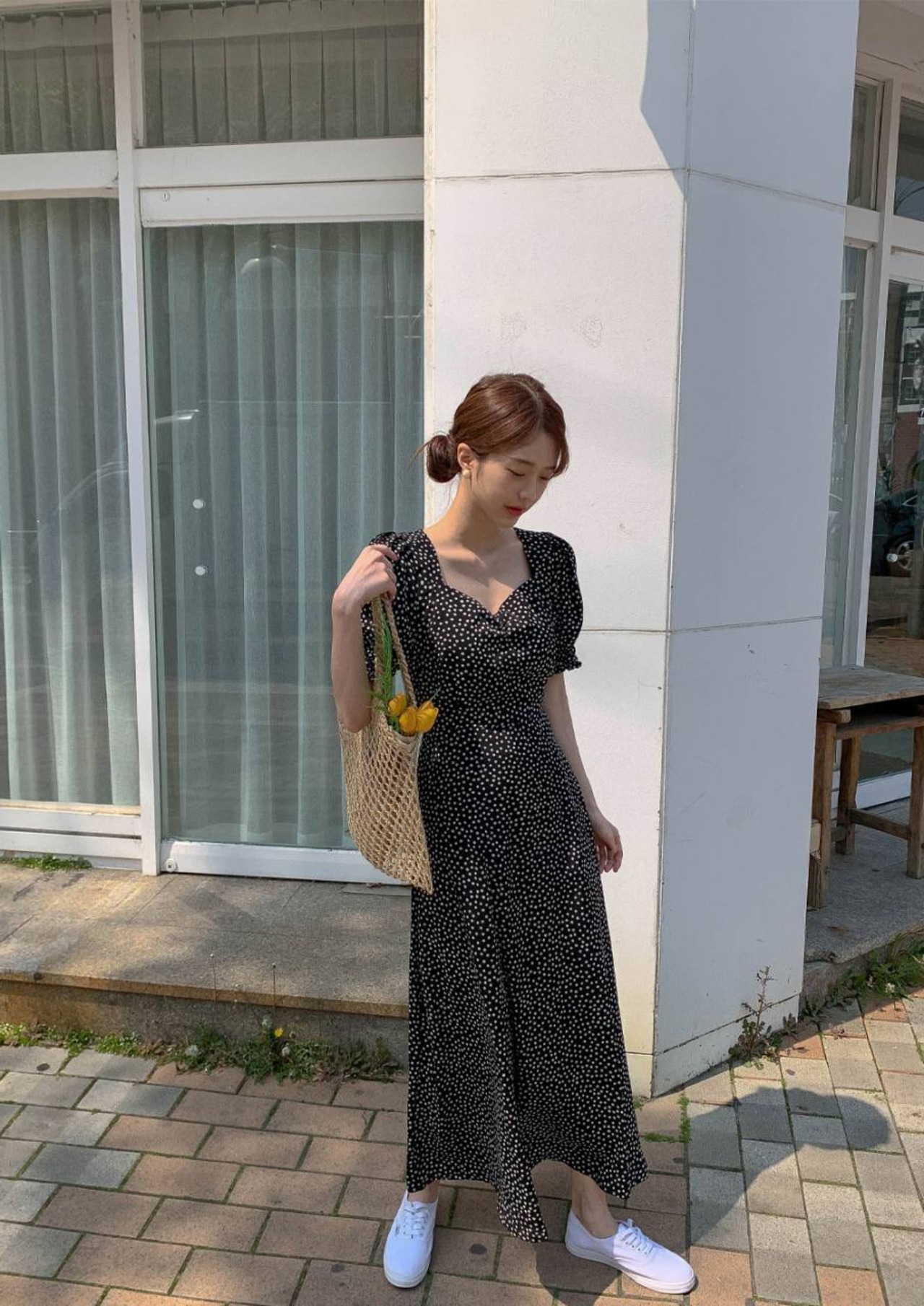 ワンピース フレアワンピース ロング ロング丈 マキシ マキシ丈 9分丈 袖あり 半袖 パフスリーブ Vネック スイートハートネック セミフレア スリム 細身 リボン バックリボン ハイウエスト かわいい 大人可愛い きれいめ シンプル 大人 上品 おしゃれ お洒落 大人女子 ラブリー キュート ガーリー 個性的 セクシー エレガント 抜け感 フェミニン ロマンチック 柄 花柄 小花柄 フラワー 総柄 春 夏 レディース 女性用 デート お出かけ 着回し 普段使い スタイル モテ 体系カバー 美脚 脚長