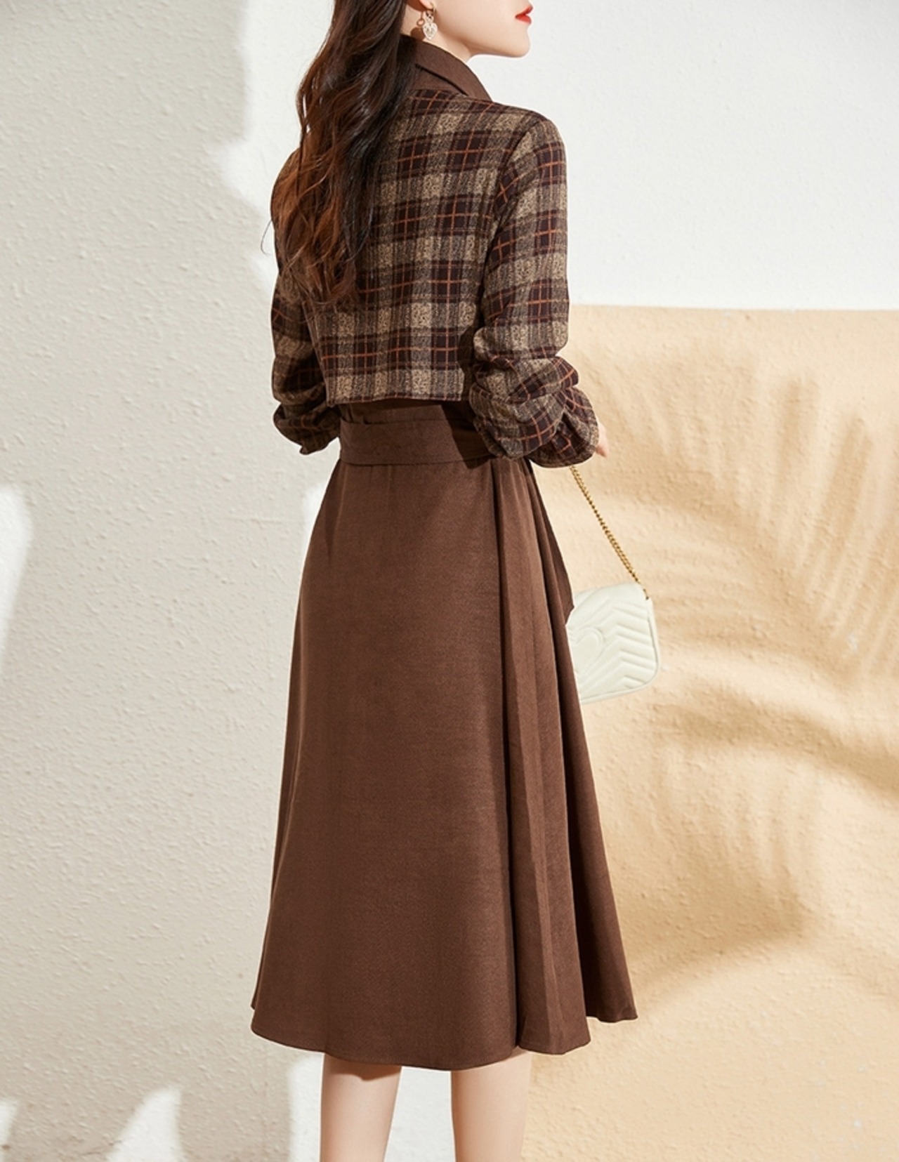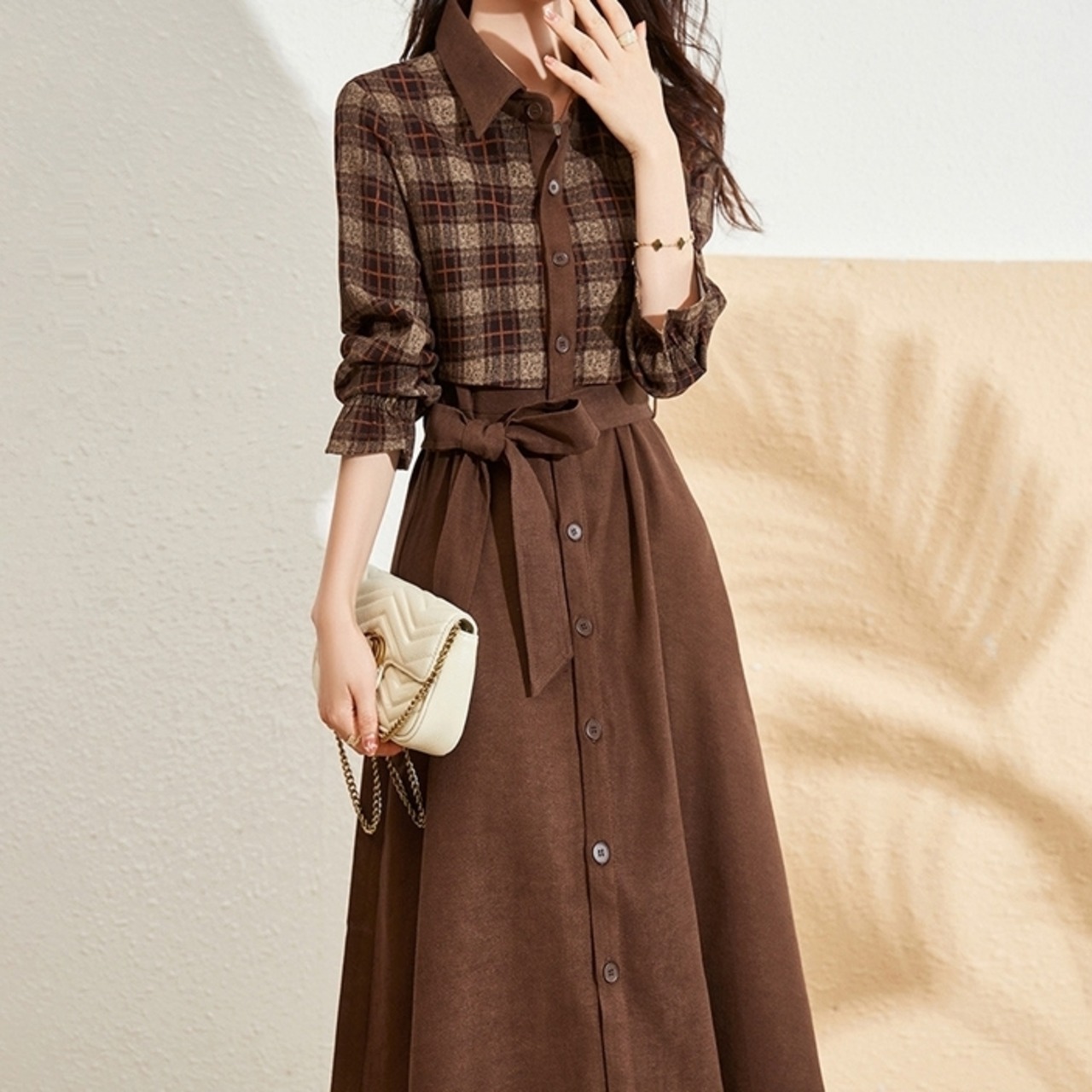チェック柄のシャツと無地のスカートをミックスしたフレアワンピース。