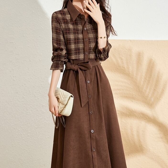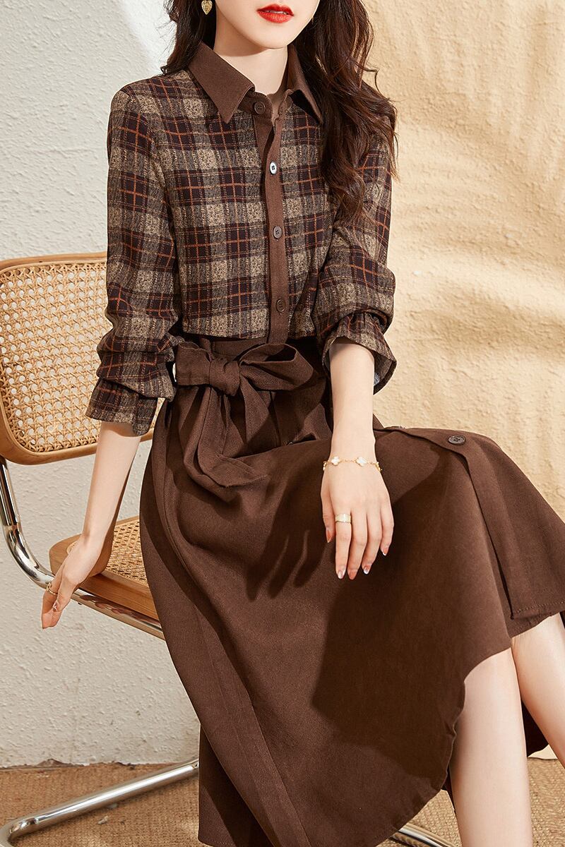 ワンピース シャツワンピース フェイクツーピース チェック柄 切替デザイン 長袖 ウエストマーク ウエストリボン 細見え フレア Aライン ミディアム丈 膝下丈 レトロ フェミニン 大人女子 オシャレ おしゃれ お洒落 きれいめ カジュアル お出かけ 通勤 デート デイリー 普段使い 女子会 お呼ばれ 旅行 春 秋 10代 20代 30代 40代 大きいサイズ レディース