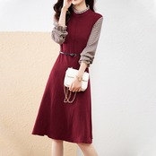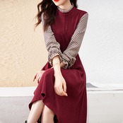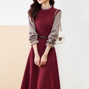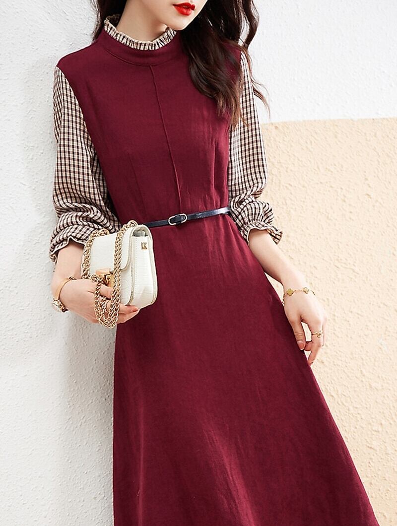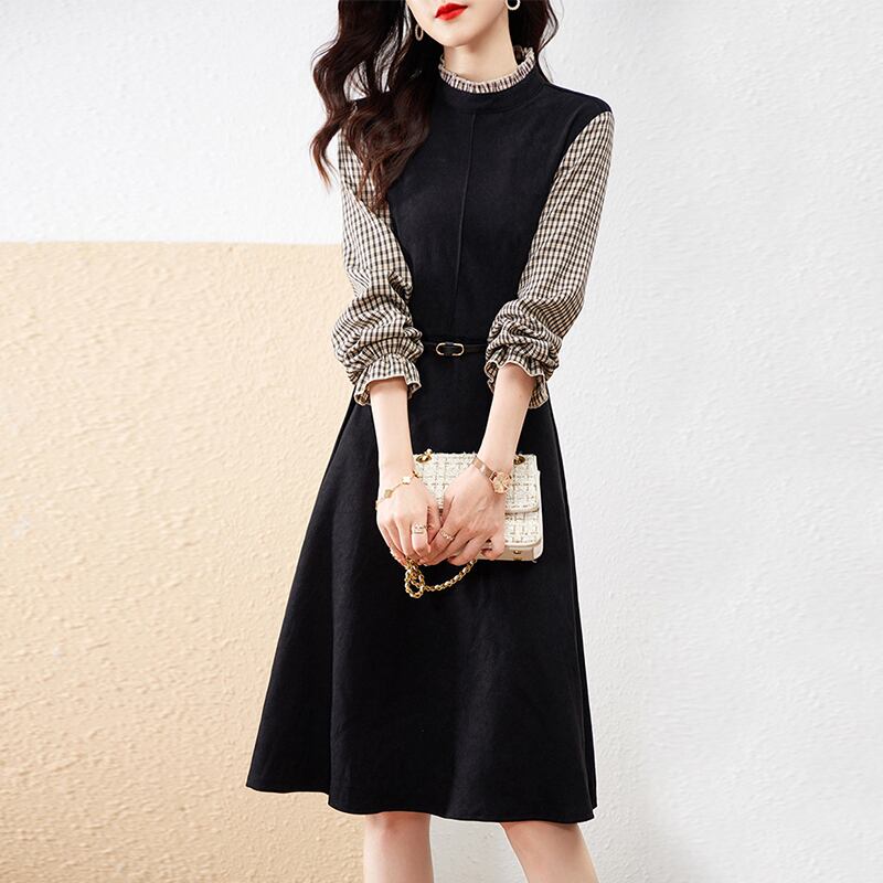 ワンピース フェイクツーピース 重ね着風 チェック柄 フリルネック スタンドカラー 七分袖 長袖 パフスリーブ 袖フリル 無地 ベルト付き ミディアム丈 膝丈 フレア Aライン レトロ 細見え 大人女子 オシャレ おしゃれ お洒落 きれいめ カジュアル お出かけ 通勤 デート デイリー 普段使い ランチ 女子会 春 秋 10代 20代 30代 40代 レディース