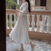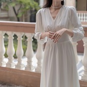 バルーンスリーブとカシュクールが上品でフェミニンなワンピースです。