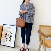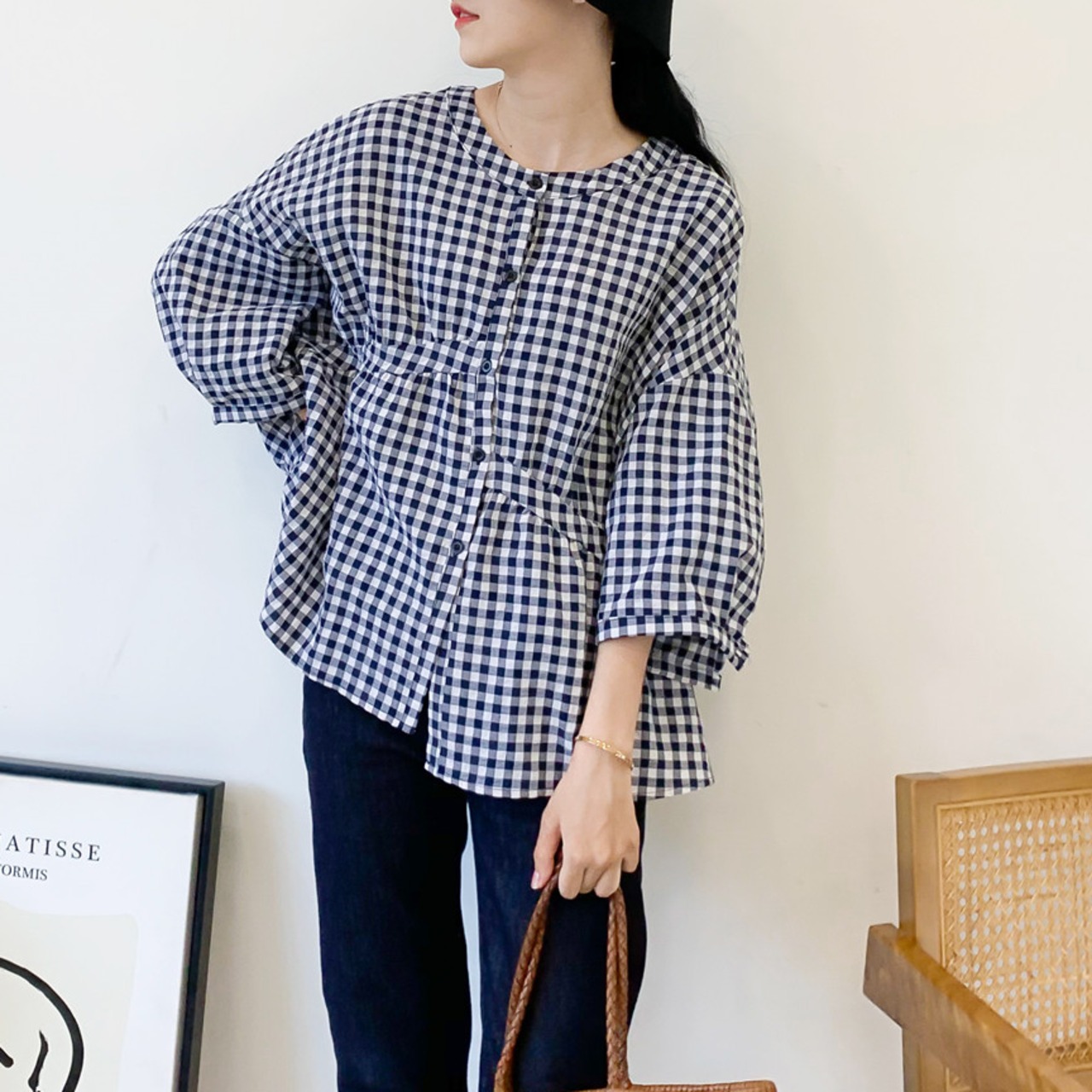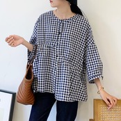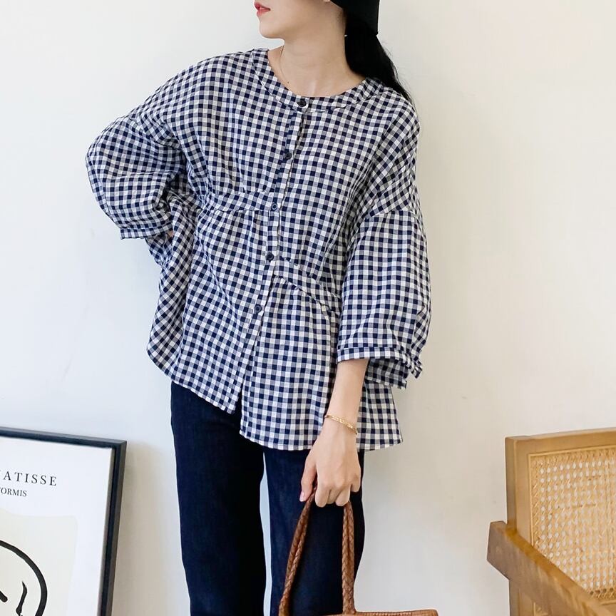 シャツ 七分袖 バンドカラー 切り替えデザイン ギンガムチェック チェック かわいい 大人可愛い きれいめ シンプル カジュアル 大人 上品 おしゃれ 大人カジュアル 大人女子 ラフ キュート 抜け感 ゆったり シック ナチュラル ベーシック 春 夏 秋 レディース ママ OL 学生 通学 デート お出かけ 公園デビュー 旅行 釣り キャンプ 着回し 普段使い 重ね着 デイリー スタイルアップ コーデ 楽ちん リラックス 体型カバー 定番 日常使い 休日