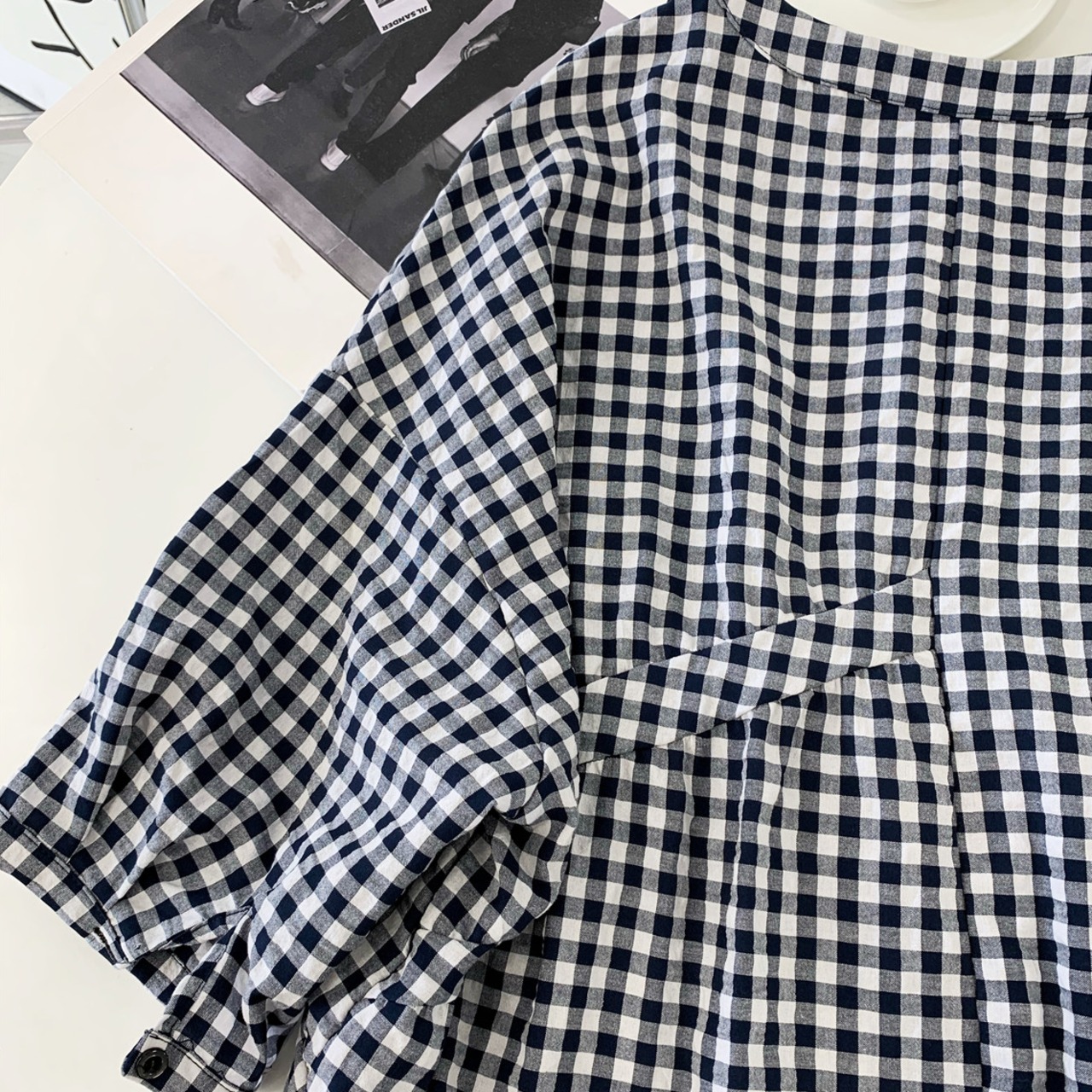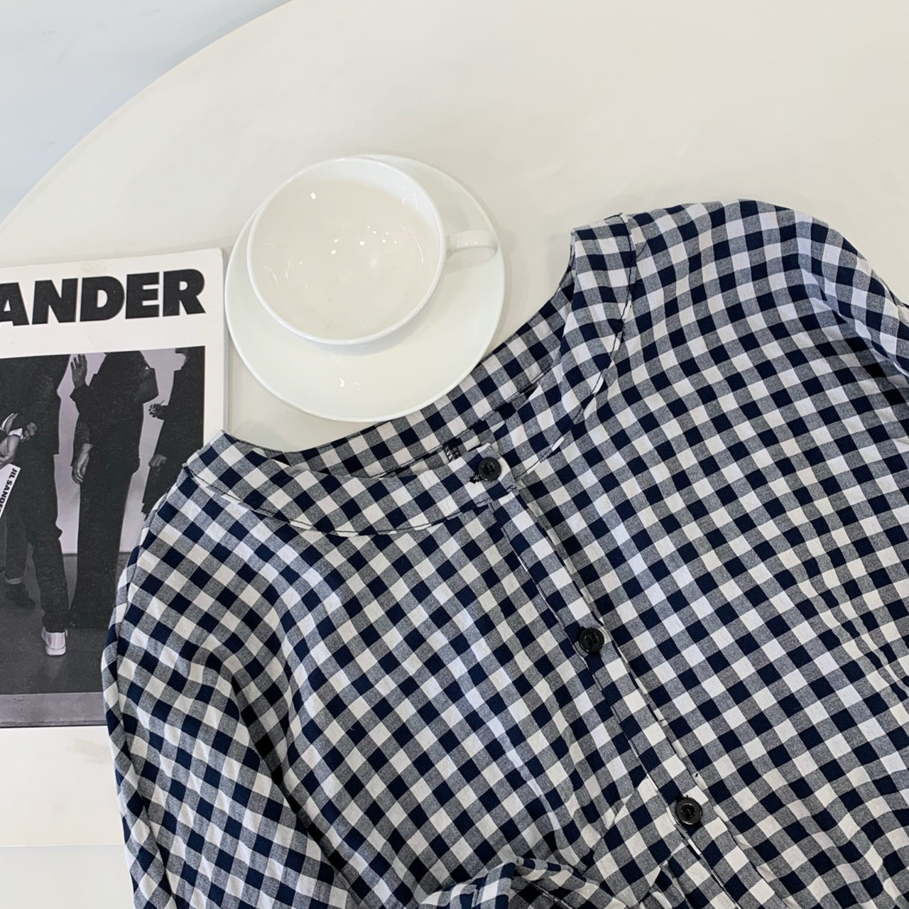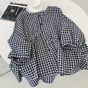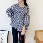 ギンガムチェックが可愛いバンドカラーシャツです。
