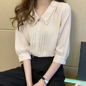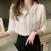 立体感のあるダブルカラーとピンタックで美人度がアップするシフォンブラウス。