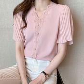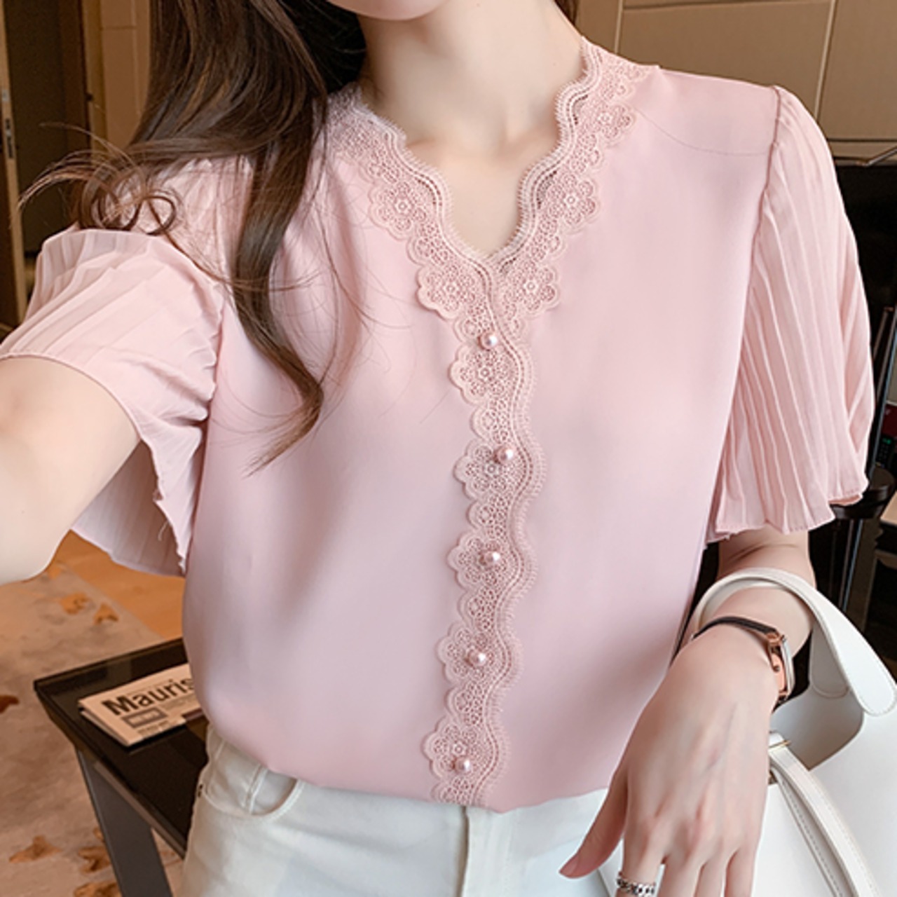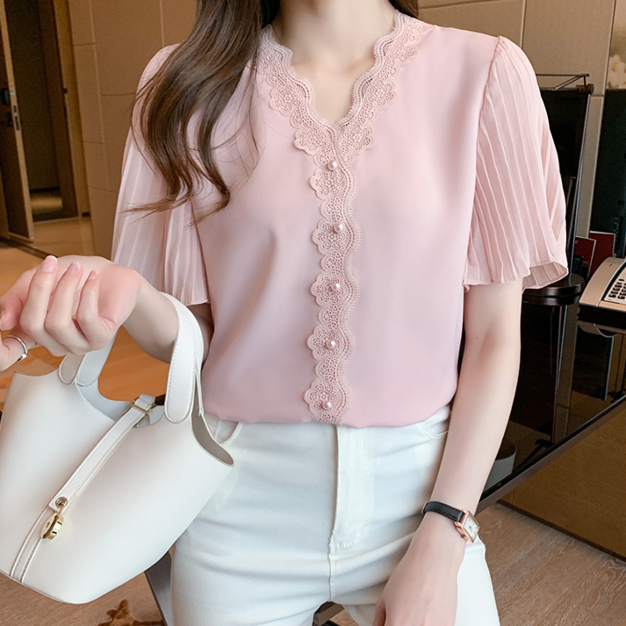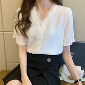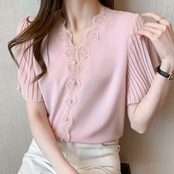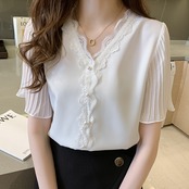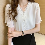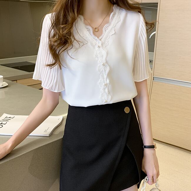 ブラウス レースカラー 半袖 Vネック 切り替えデザイン プリーツ レース シフォン 透け感 無地 パール かわいい 大人可愛い きれいめ シンプル 大人 上品 おしゃれ レトロ 大人カジュアル 大人女子 キュート ガーリー フェミニン フォーマル ナチュラル ベーシック 春 夏 レディース オフィス ビジネス OL 通勤 学生 通学 デート お出かけ 公園デビュー 女子会 旅行 リモート会議 ホテル レストラン 着回し 普段使い 重ね着 デイリー コーデ モテ きちんと感 日常使い 休日