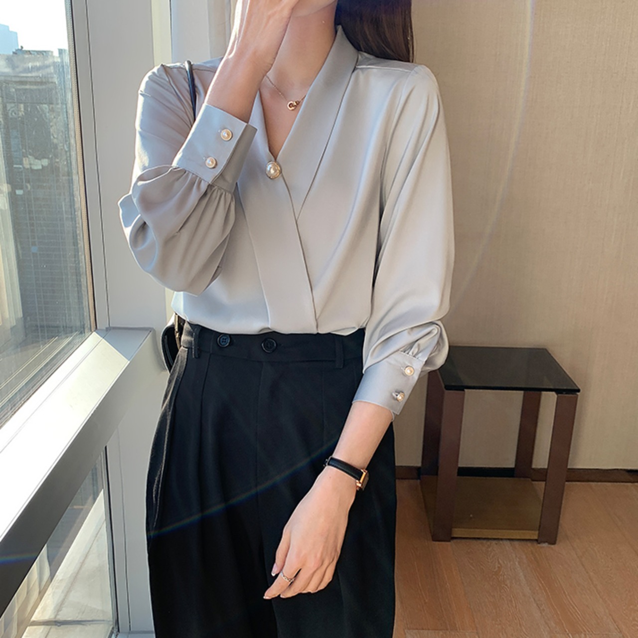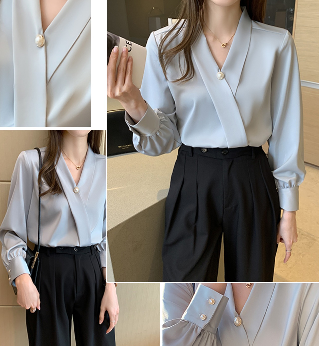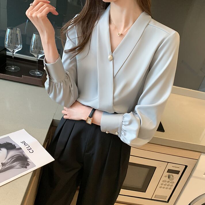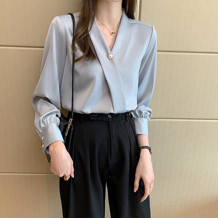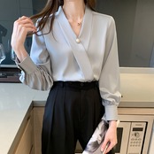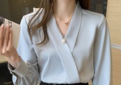 ブラウス 長袖 Vネック カシュクール シフォン 無地 パール かわいい 大人可愛い きれいめ シンプル 大人 上品 おしゃれ レトロ 大人カジュアル 大人女子 キュート ガーリー フェミニン フォーマル ナチュラル ベーシック 春 夏 レディース オフィス ビジネス OL 通勤 学生 通学 デート お出かけ 公園デビュー 女子会 旅行 リモート会議 ホテル レストラン 着回し 普段使い 重ね着 デイリー コーデ モテ きちんと感 日常使い 休日