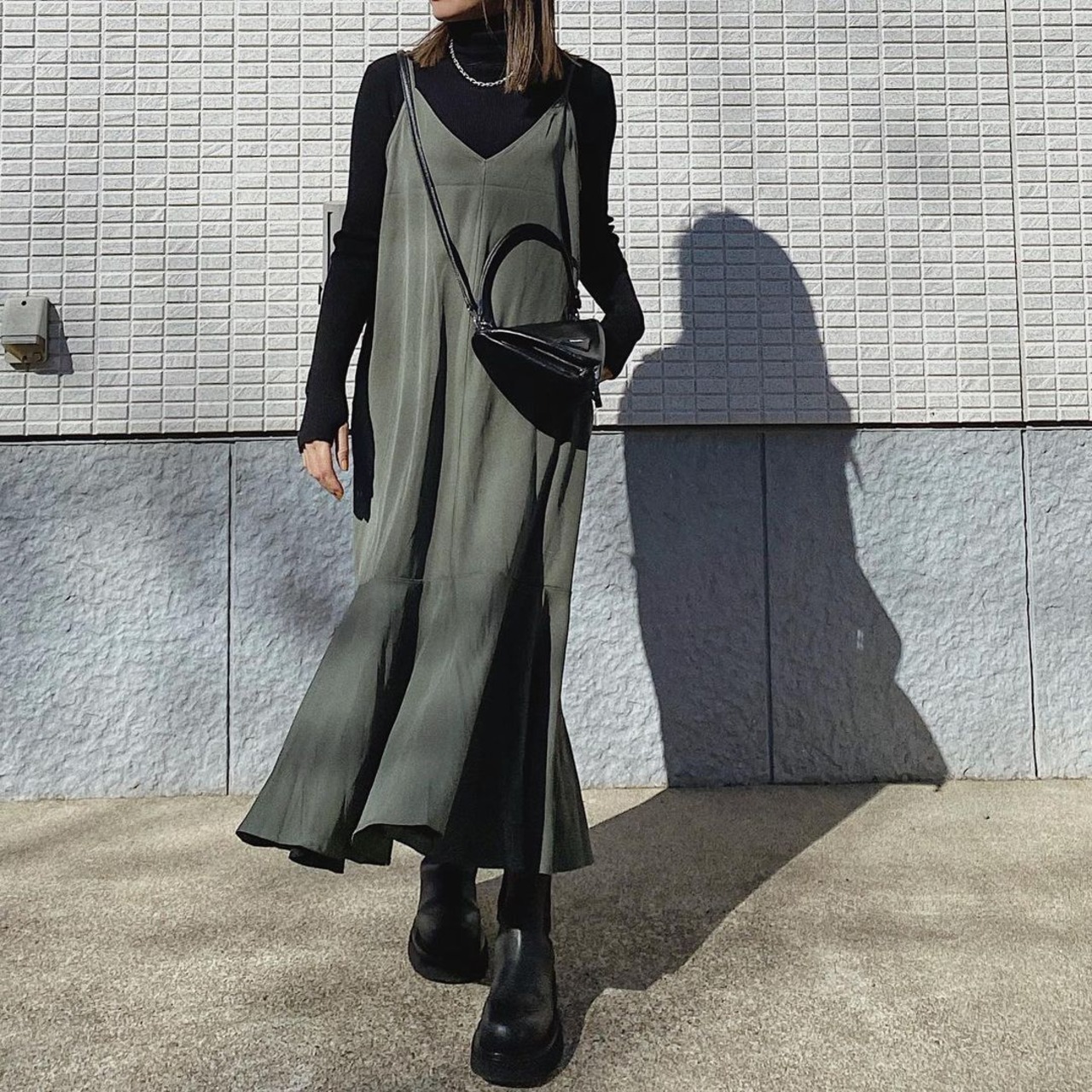 上品なマーメイドスタイルのストラップワンピース。