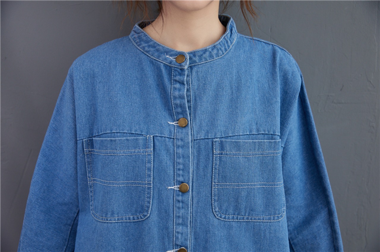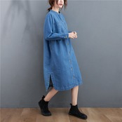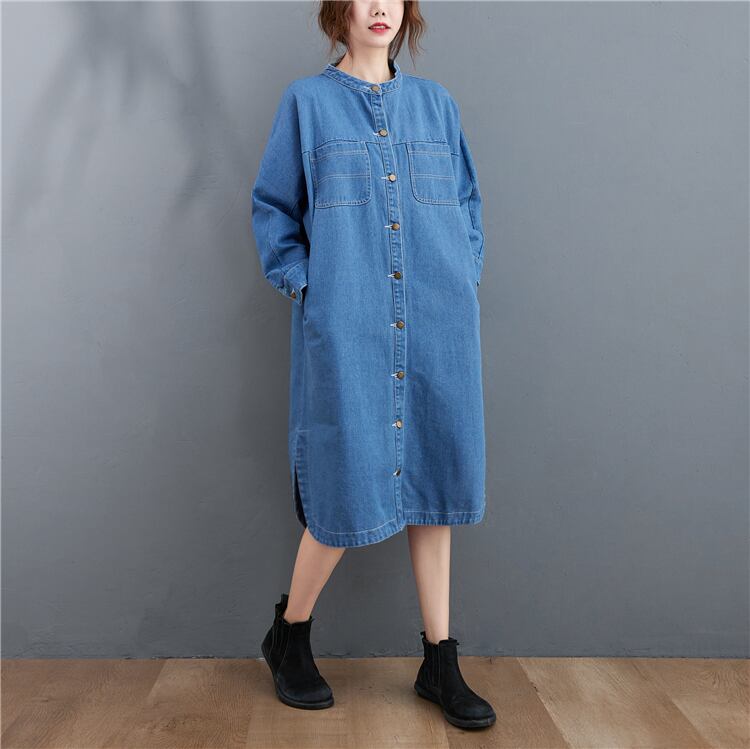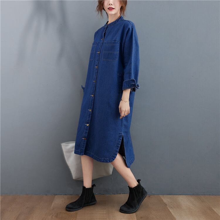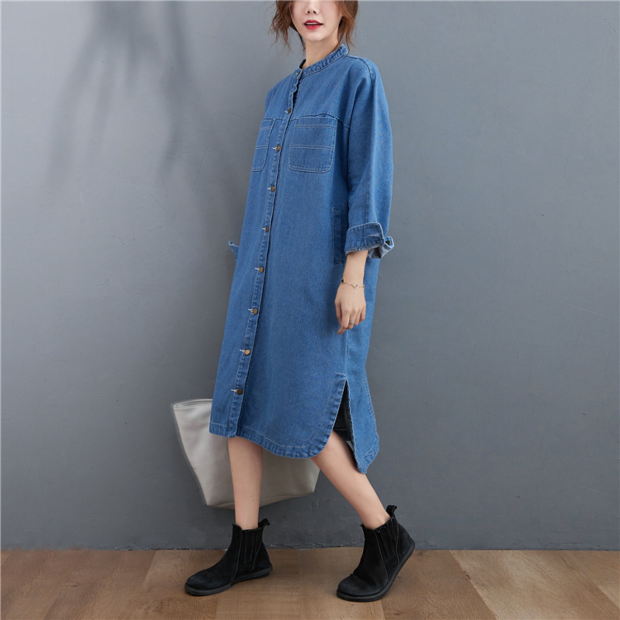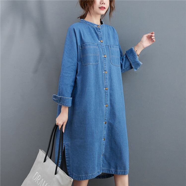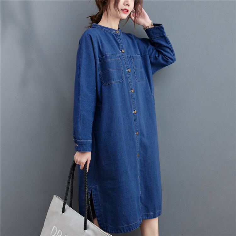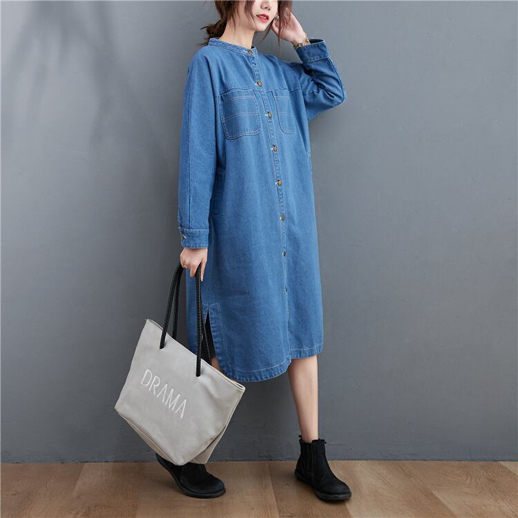 ワンピース デニムワンピース シャツワンピース スタンドカラー 長袖 フロントボタン ストレート サイドスリット ミディアム丈 ミモレ丈 レトロ セミフレア シンプル ゆったり 大人女子 大人可愛い オシャレ おしゃれ お洒落 カジュアル デイリー 普段使い お出かけ デート ランチ カフェ 旅行 リゾート 休日 春 秋 20代 30代 40代 50代 レディース