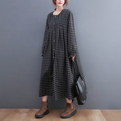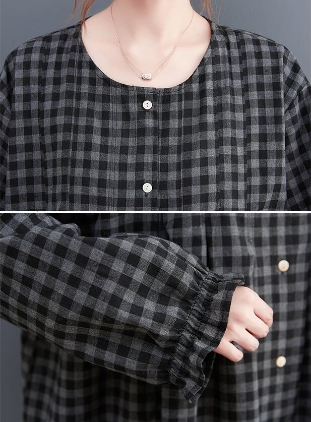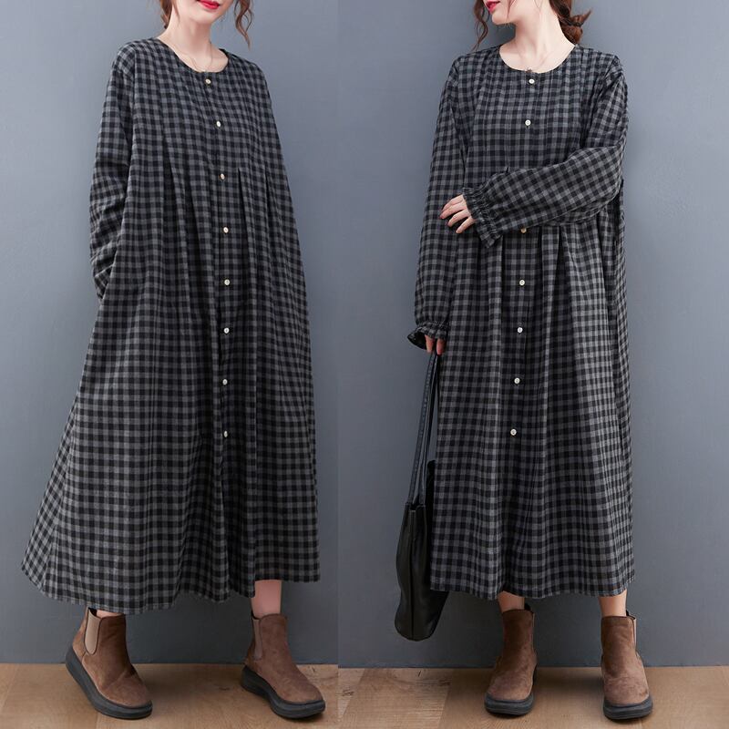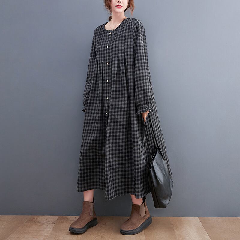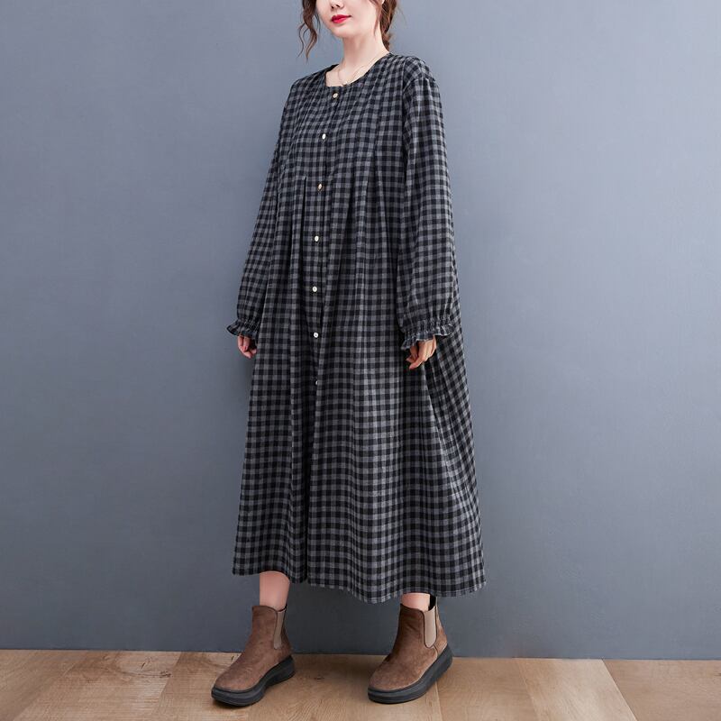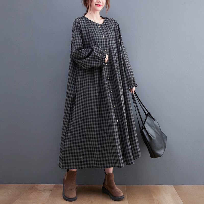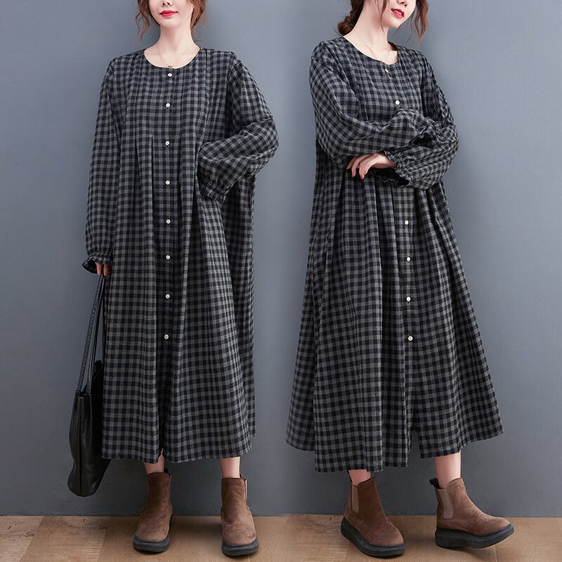 ワンピース シャツワンピース チェック柄 ロングワンピース 襟なし 長袖 フロントボタン ロング丈 ミモレ丈 フレア Aライン ゆったり 大人女子 大人可愛い 体型カバー オシャレ おしゃれ お洒落 きれいめ カジュアル デイリー 普段使い お出かけ デート ランチ カフェ 旅行 リゾート 休日 春 秋 20代 30代 40代 50代 レディース