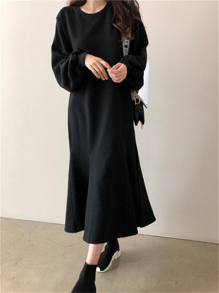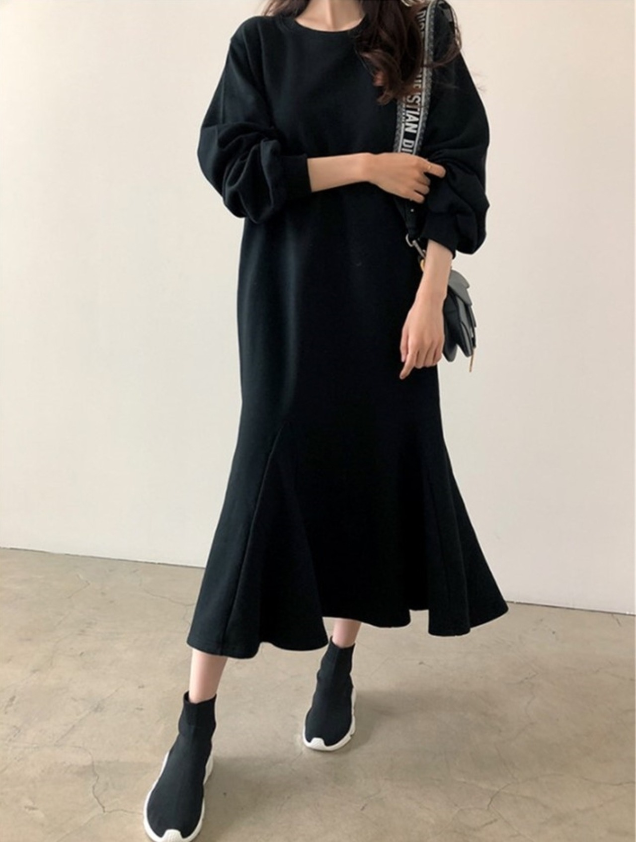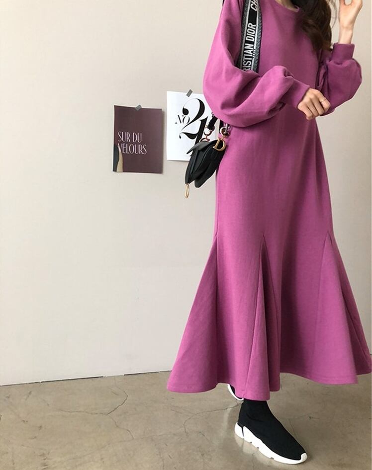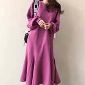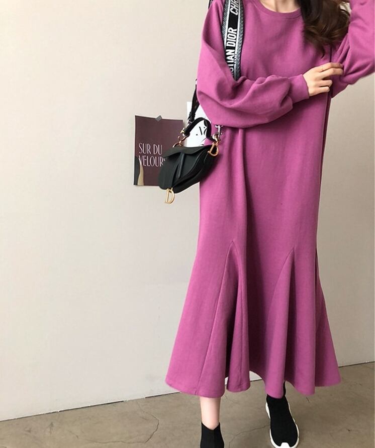 ワンピース マーメイドスタイル Tシャツワンピース ロングワンピース ラウンドネック 長袖 パフスリーブ ボリューム袖 ロング丈 ゆったり 大人女子 大人可愛い オシャレ おしゃれ お洒落 きれいめ カジュアル デイリー 普段使い お出かけ デート ランチ カフェ 旅行 リゾート 休日 春 秋 冬 20代 30代 40代 50代 レディース