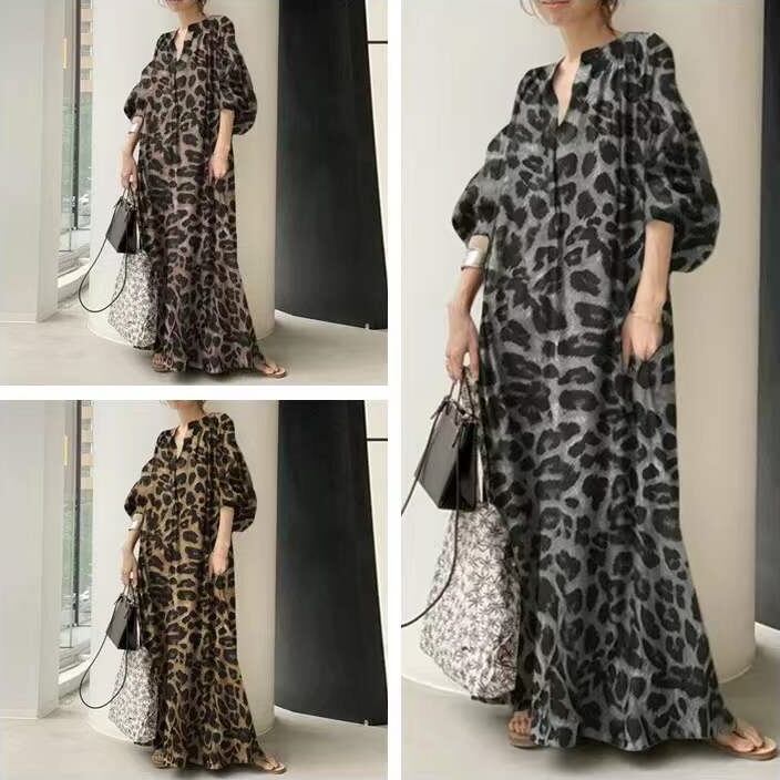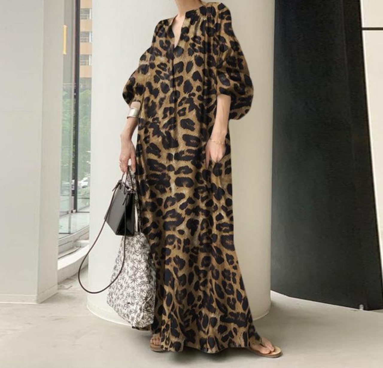 ふんわり感のあるシルエットにヒョウ柄が映えるロングワンピース。