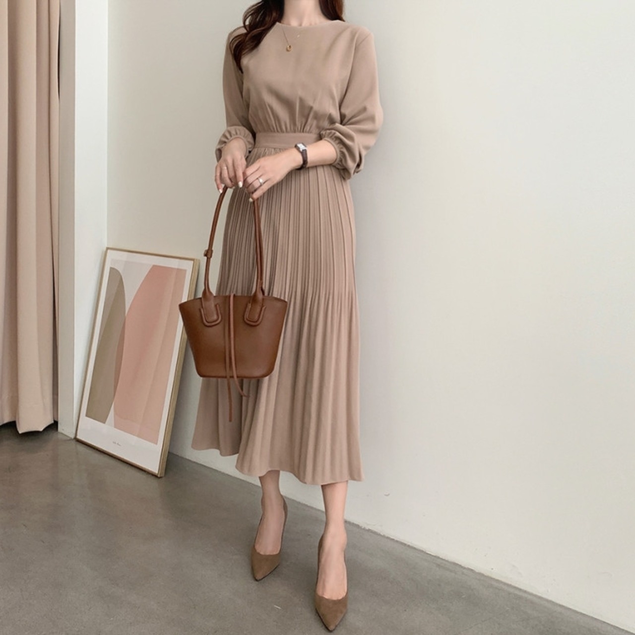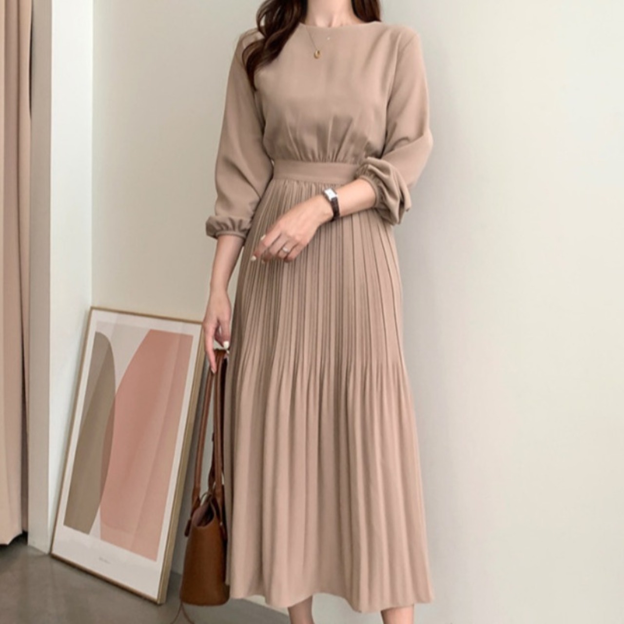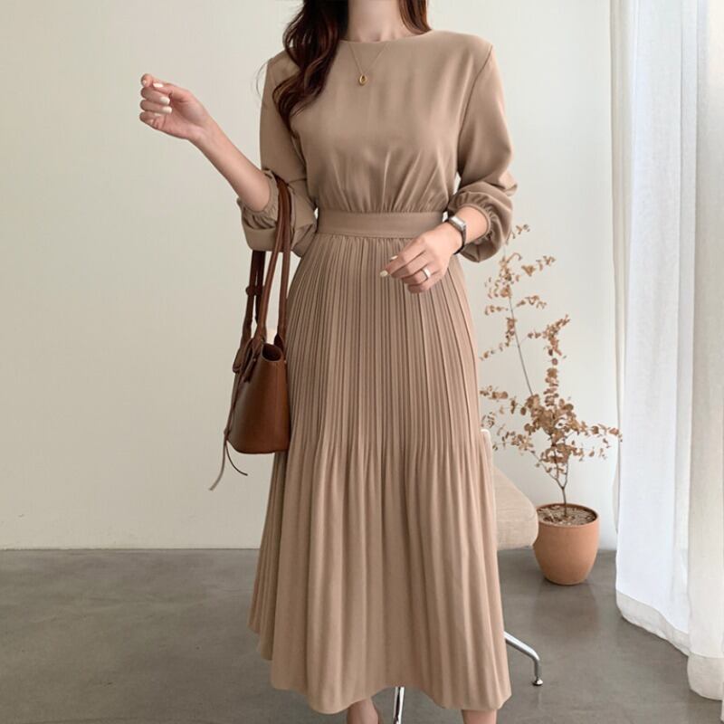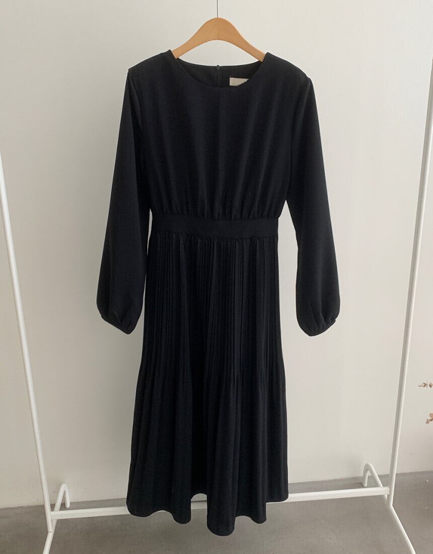 ワンピース プリーツ ロングワンピース ラウンドネック 襟なし 長袖 パフスリーブ ボリューム袖 ウエストマーク リボンベルト バックリボン ロング丈 Aライン 大人女子 エレガント フェミニン オシャレ おしゃれ お洒落 きれいめ カジュアル デイリー 普段使い お出かけ デート 通勤 お呼ばれ ランチ 旅行 休日 春 秋 20代 30代 40代 50代 レディース