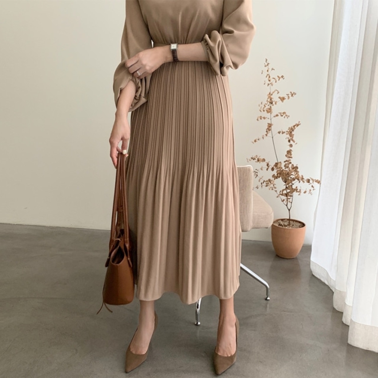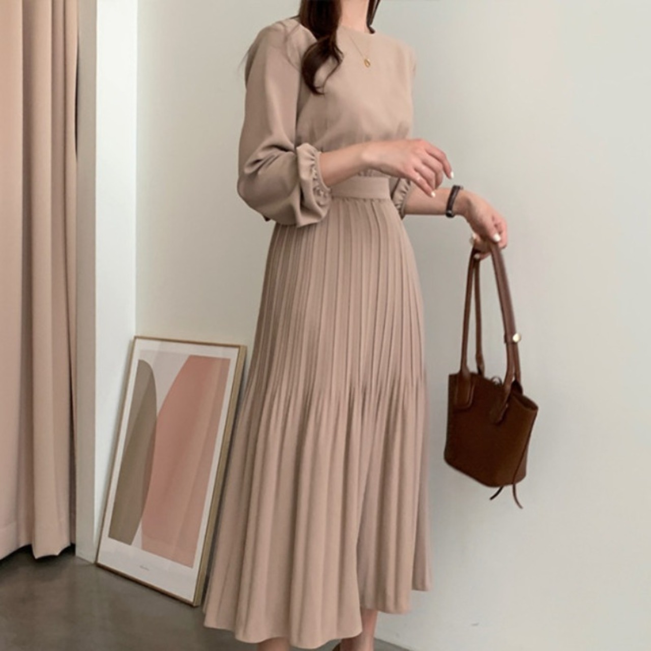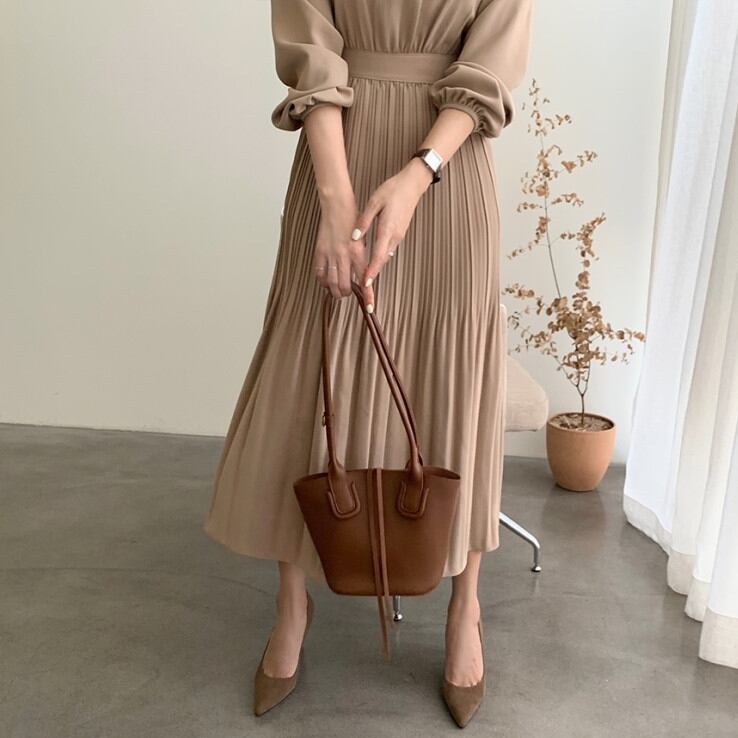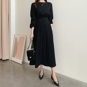 歩くたびに揺れるプリーツデザインがエレガントなロングワンピース。