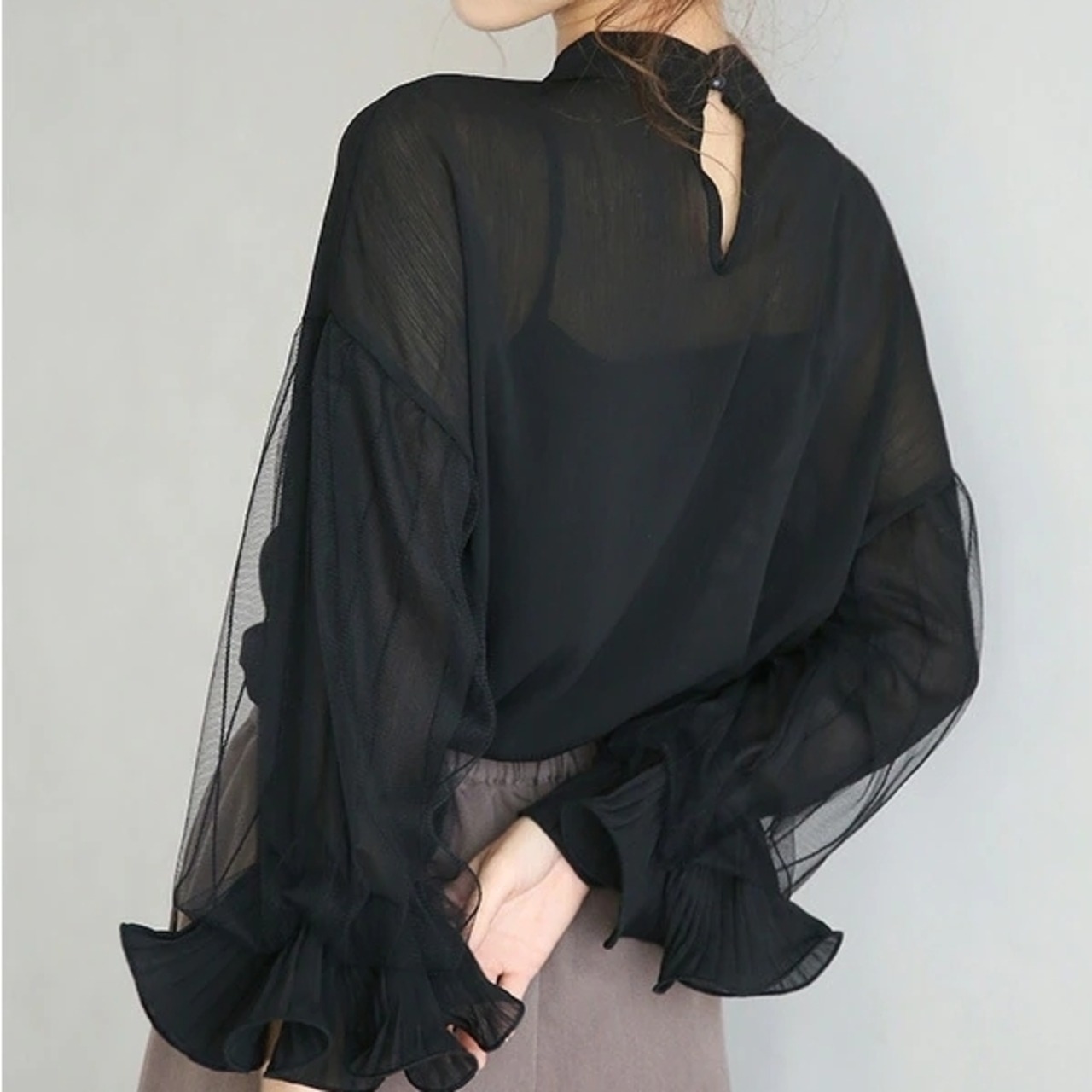 トップス ブラウス スタンドカラー 長袖 キャンディスリーブ ボリューム袖 袖フリル シアー 透け感 無地 ドロップショルダー バックスリット ミディアム丈 レトロ トレンド 大人女子 大人可愛い 甘め オシャレ おしゃれ お洒落 きれいめ カジュアル お出かけ デート デイリー 普段使い ランチ カフェ 女子会 お呼ばれ 春 秋 10代 20代 30代 40代 レディース