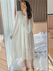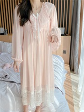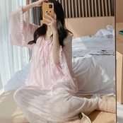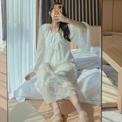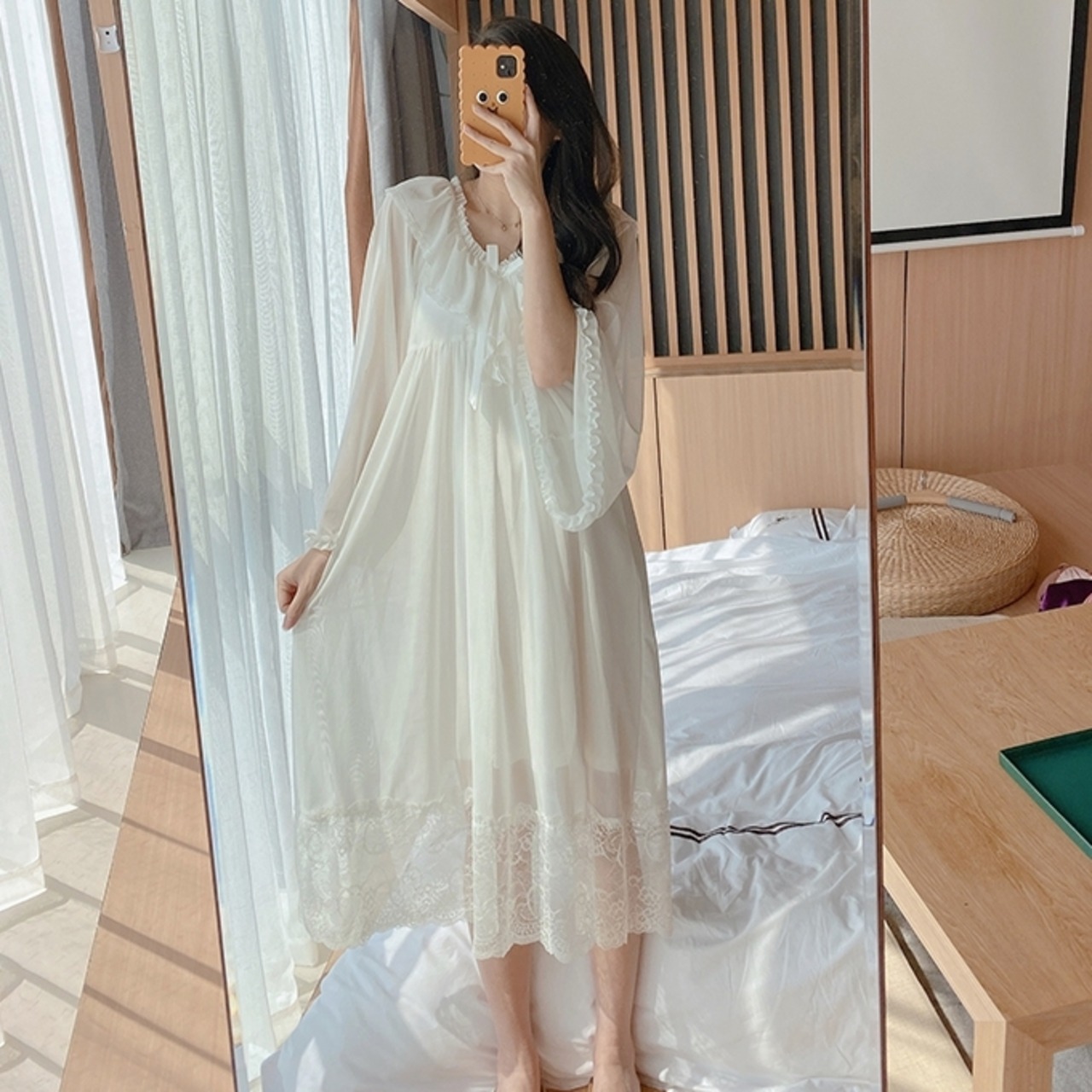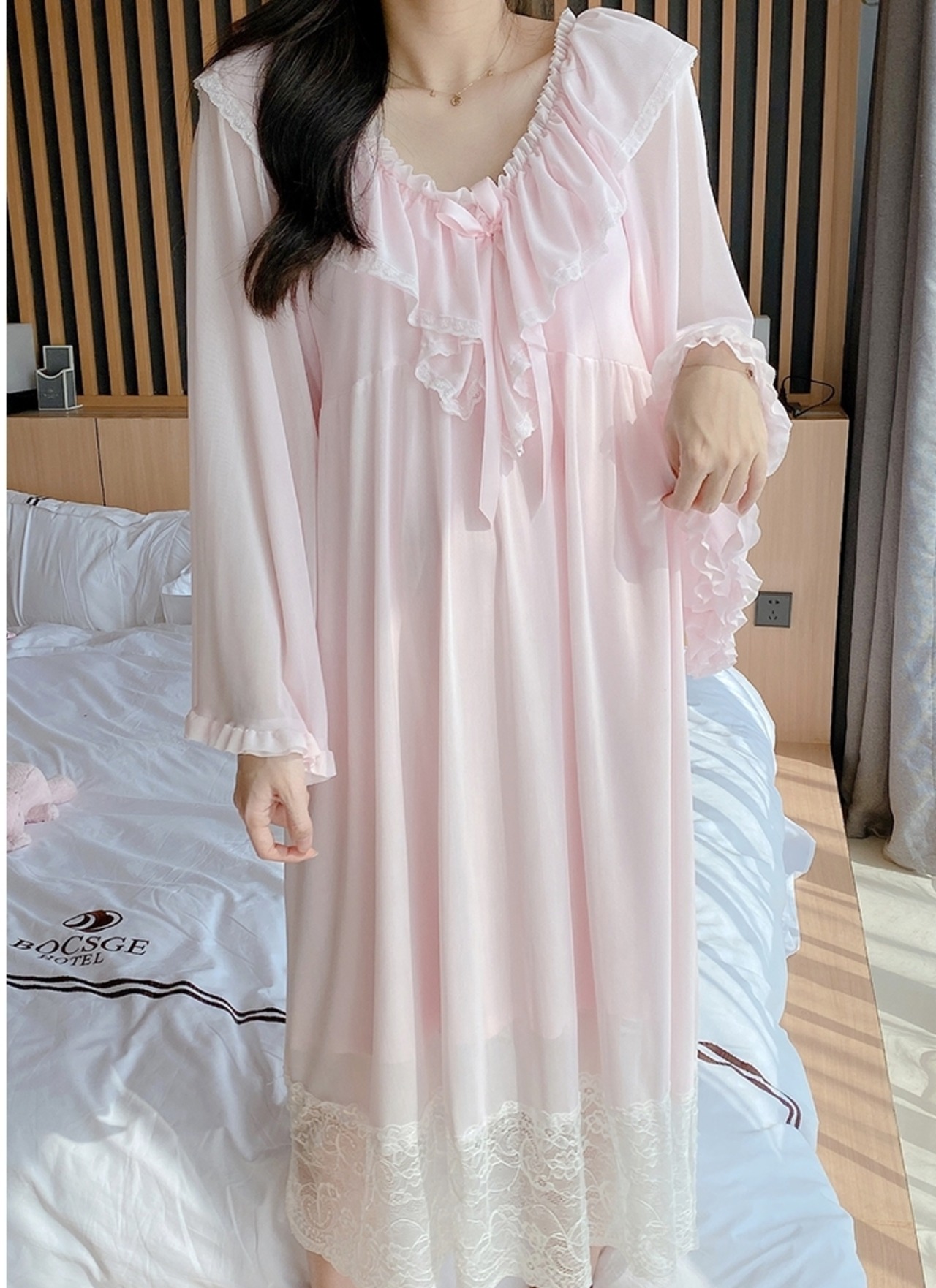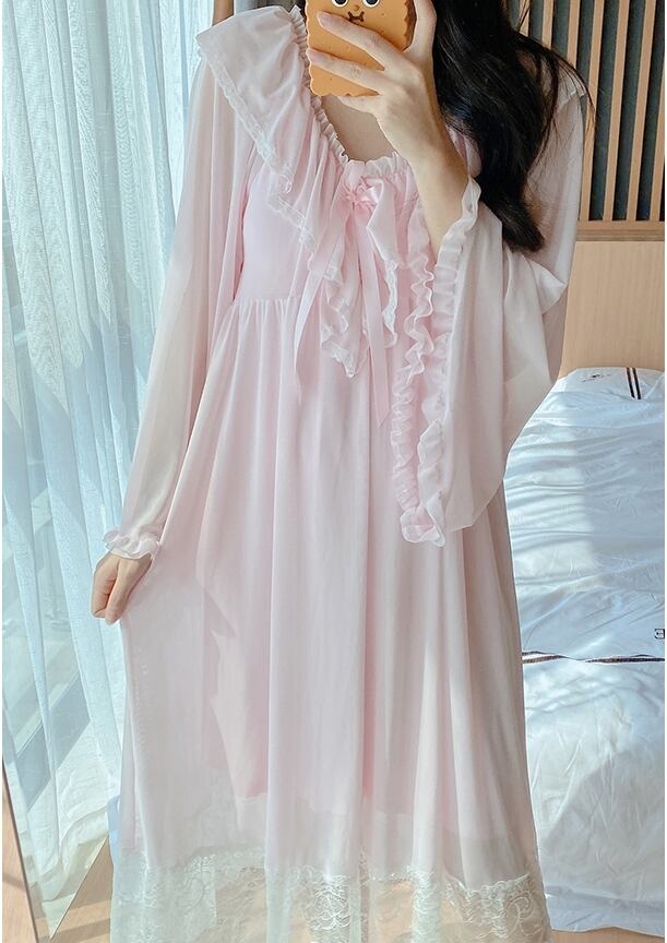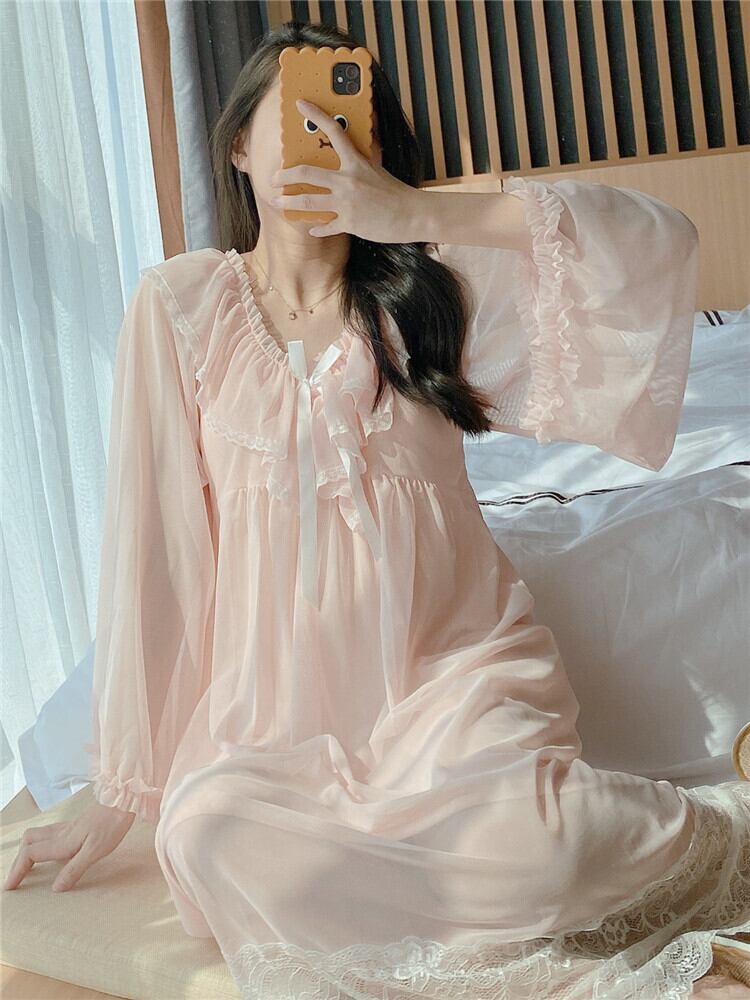 ルームウェア ナイトウェア パジャマ ネグリジェ ワンピース 長袖 フレアスリーブ レース シアー 透け感 リボン フリル リラックス ふんわり 体型カバー フレア Aライン ロング丈 胸パッド付 大人女子 大人可愛い オシャレ おしゃれ お洒落 きれいめ デイリー 普段使い おうちコーデ 春 秋 10代 20代 30代 40代 レディース