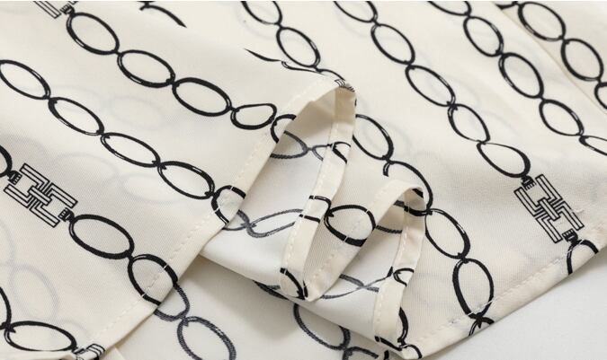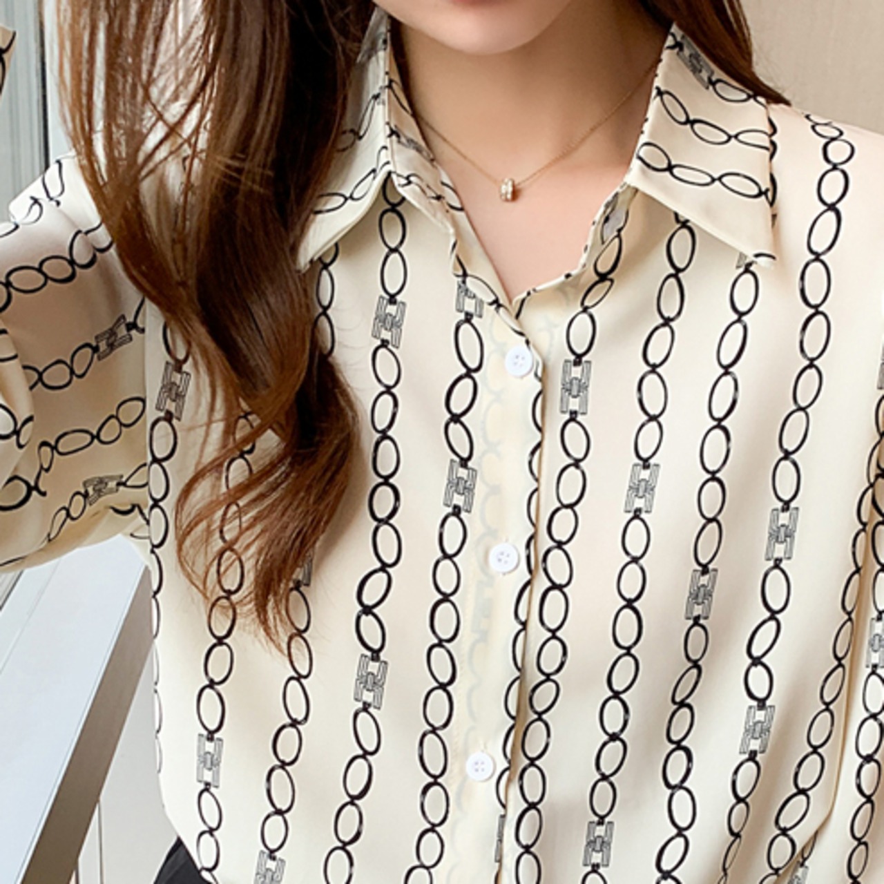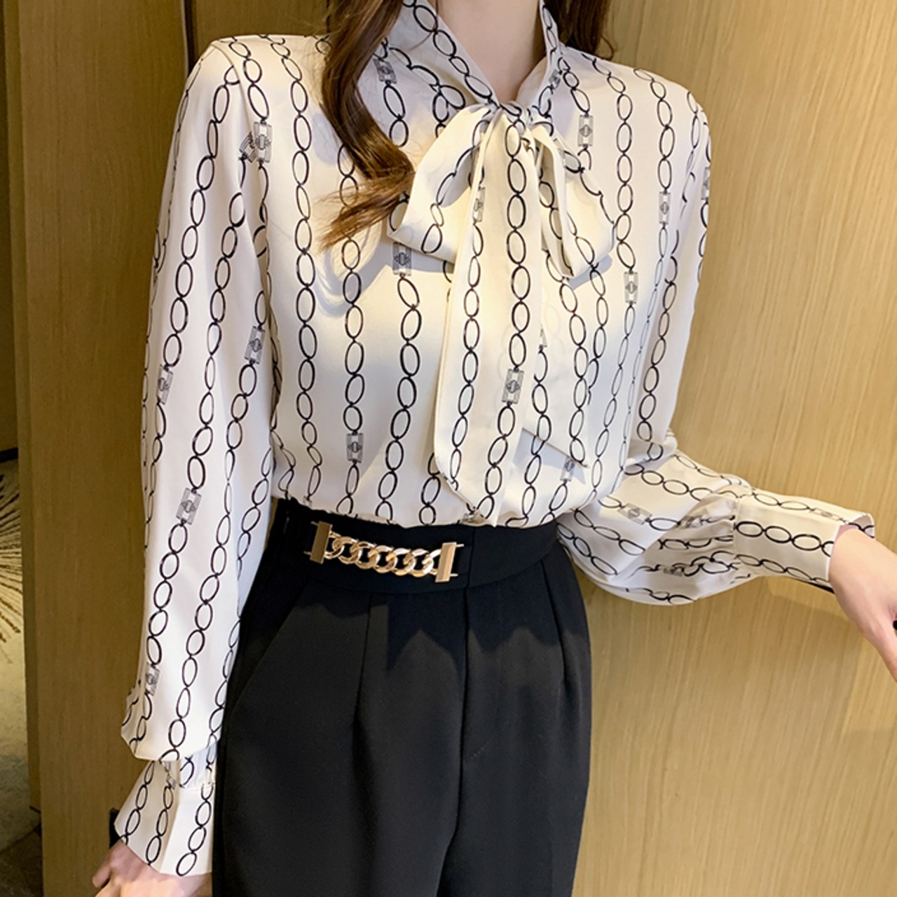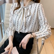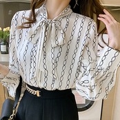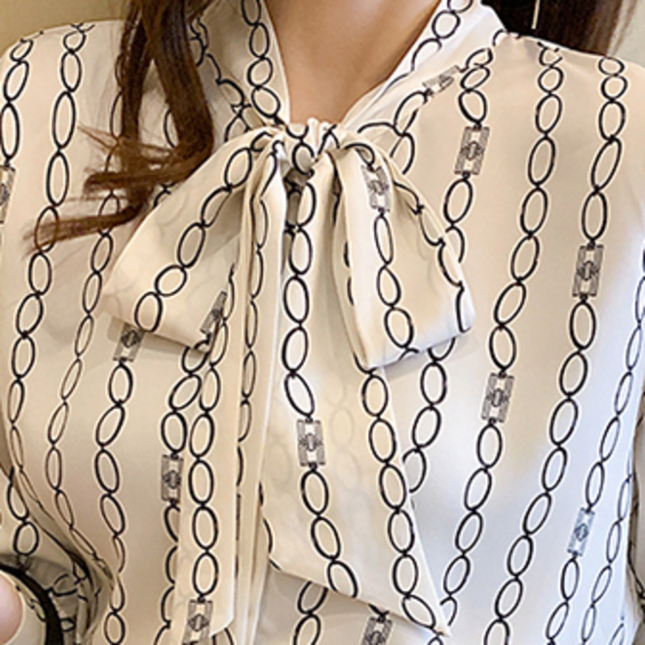 ブラウス 長袖 ボウタイ シフォン プリント チェーン柄 大人可愛い きれいめ シンプル カジュアル 大人 上品 おしゃれ かっこいい レトロ 大人女子 こなれ感 フェミニン エレガント 存在感 とろみ感 春 夏 秋 レディース オフィス ビジネス OL 通勤 学生 通学 デート お出かけ リモート会議 レストラン 着回し 普段使い 重ね着 華奢見え 美デコルテ デイリー スタイルアップ コーデ モテ 日常使い 休日