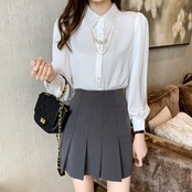 レースカラーとアクセサリーが印象的なブラウスです。