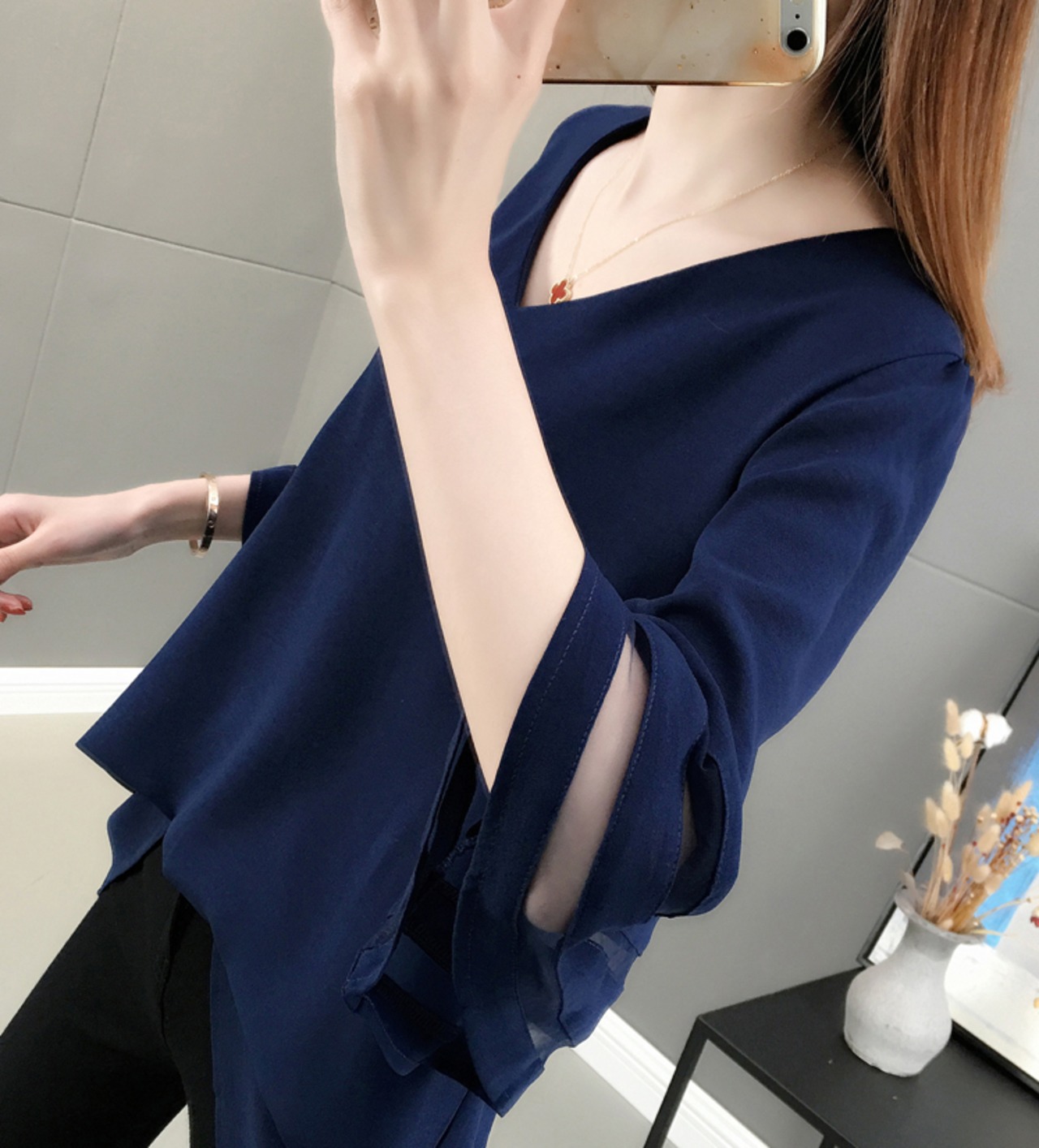 袖口のシースルー切り替えがスタイリッシュなフィッシュテールカットソーです。