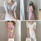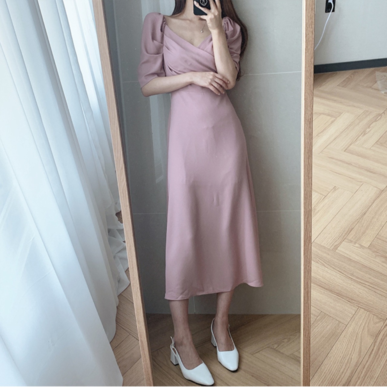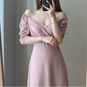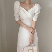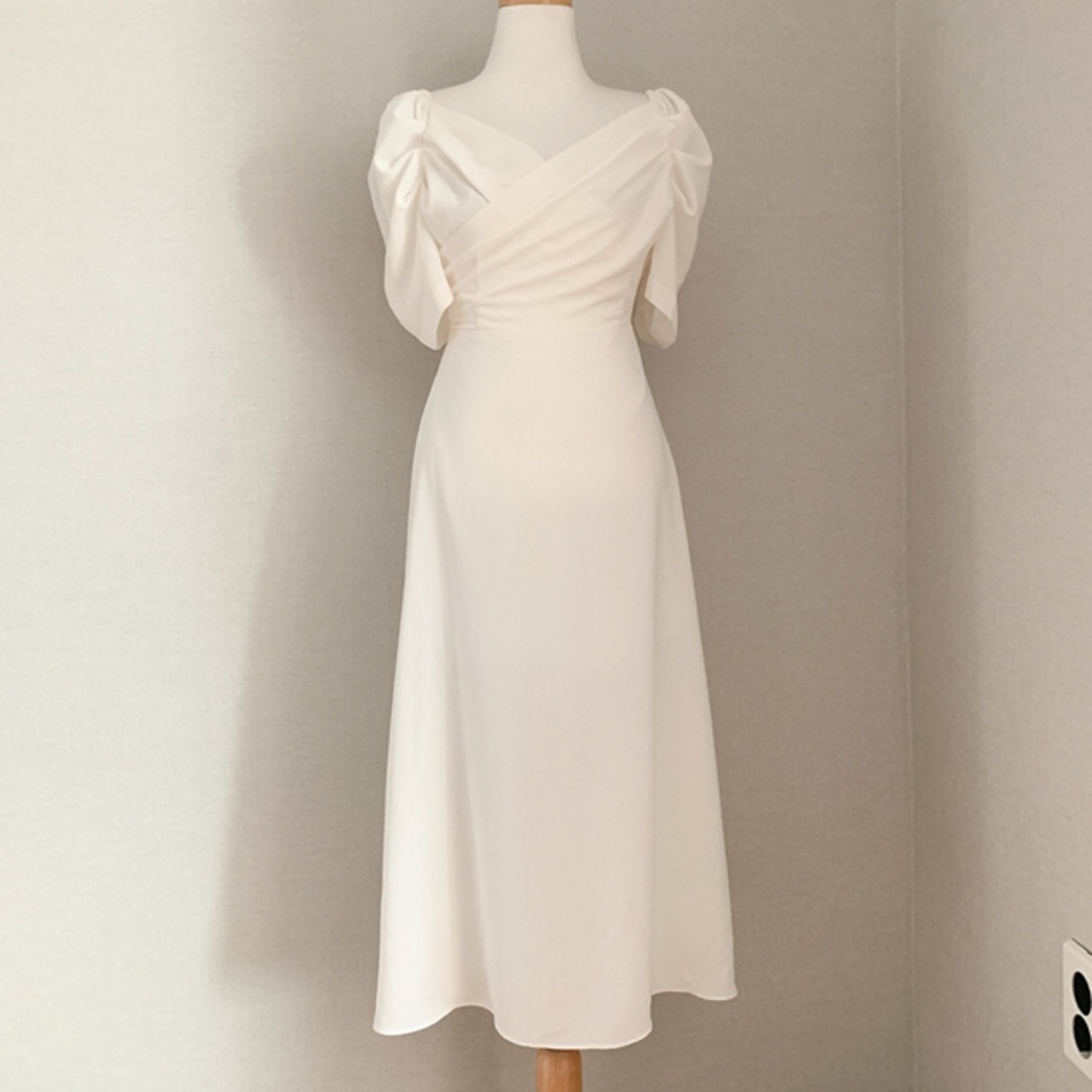 ワンピース パーティドレス Aラインドレス ミモレ丈 5分袖 パフスリーブ Vネック カシュクール オフショル Aライン ハイウエスト 大人可愛い きれいめ シンプル 大人 上品 おしゃれ 大人可愛い 大人女子 キュート セクシー エレガント 存在感 フォーマル 華やか クラシック 無地 レディース 女性用 OL 学生 デート お出かけ お泊まり パーティー イベント 旅行 ホテル レストラン 体型カバー 二の腕カバー 美脚 脚長 モテ 夏 ウェディング ブライダル 結婚式 二次会 お呼ばれ イベント